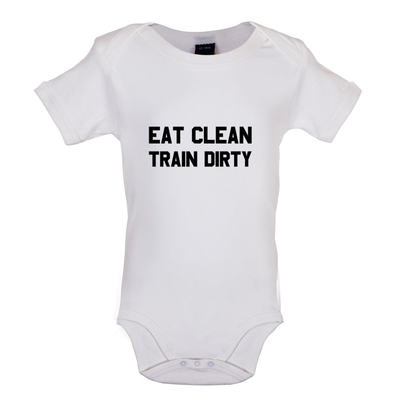 Babygrow/Bodysuit: Our Baby unisex style Eat Clean Train Dirty Babygrow is printed on our 200 GSM short sleeve bodysuit and is available in a choice of 6 different Colours.