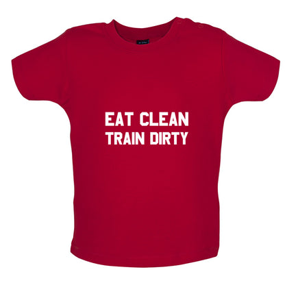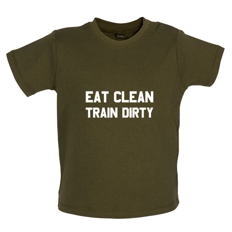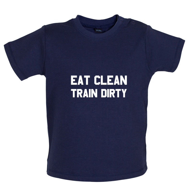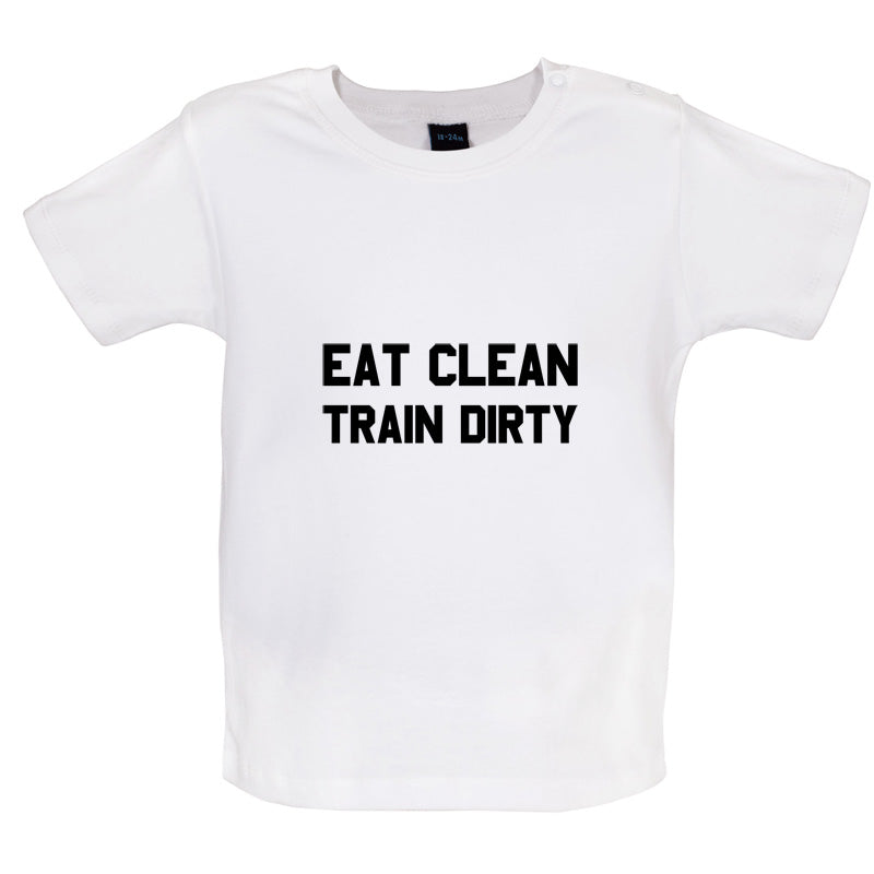 Baby/Toddler T-shirt: Our Baby Unisex style Eat Clean Train Dirty T-shirt is printed on our high quality 200 gsm ringspun cotton garment which features shoulder poppers to ease getting your little one dressed. Our Baby T-shirts are available in a choice of Eight colours.