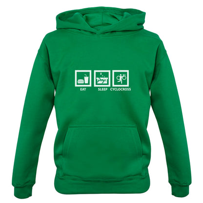 Kids Hoodie: Our kids unisex style Eat Sleep Cyclocross Hoodie is printed on our 300 GSM kangaroo pocket hooded top and is available on 7 different Colours.