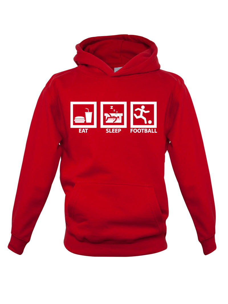Kids Hoodie: Our kids unisex style Eat Sleep Football Hoodie is printed on our 300 GSM kangaroo pocket hooded top and is available on 7 different Colours.