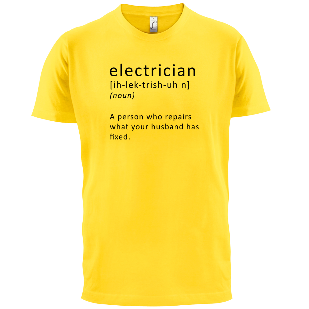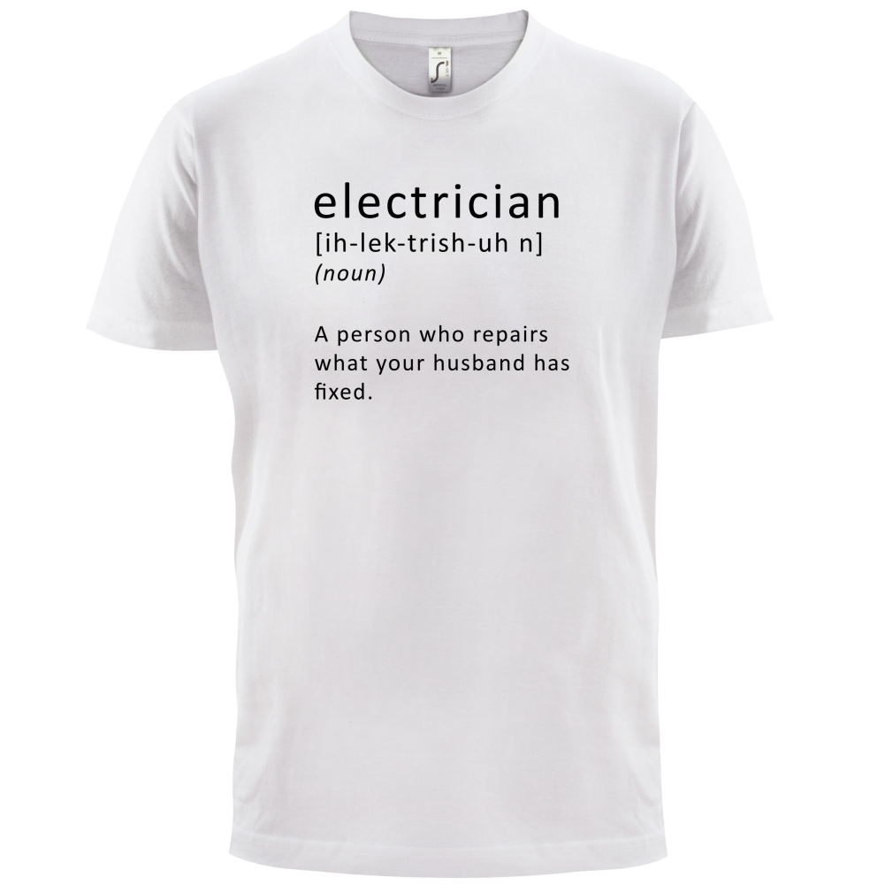 Mens Unisex T-Shirt, our men's Electrician Definition t shirt is printed onto our premium 190 GSM one piece crew neck t-shirt. Available in 10 Colours and from Size Small to XXL.
