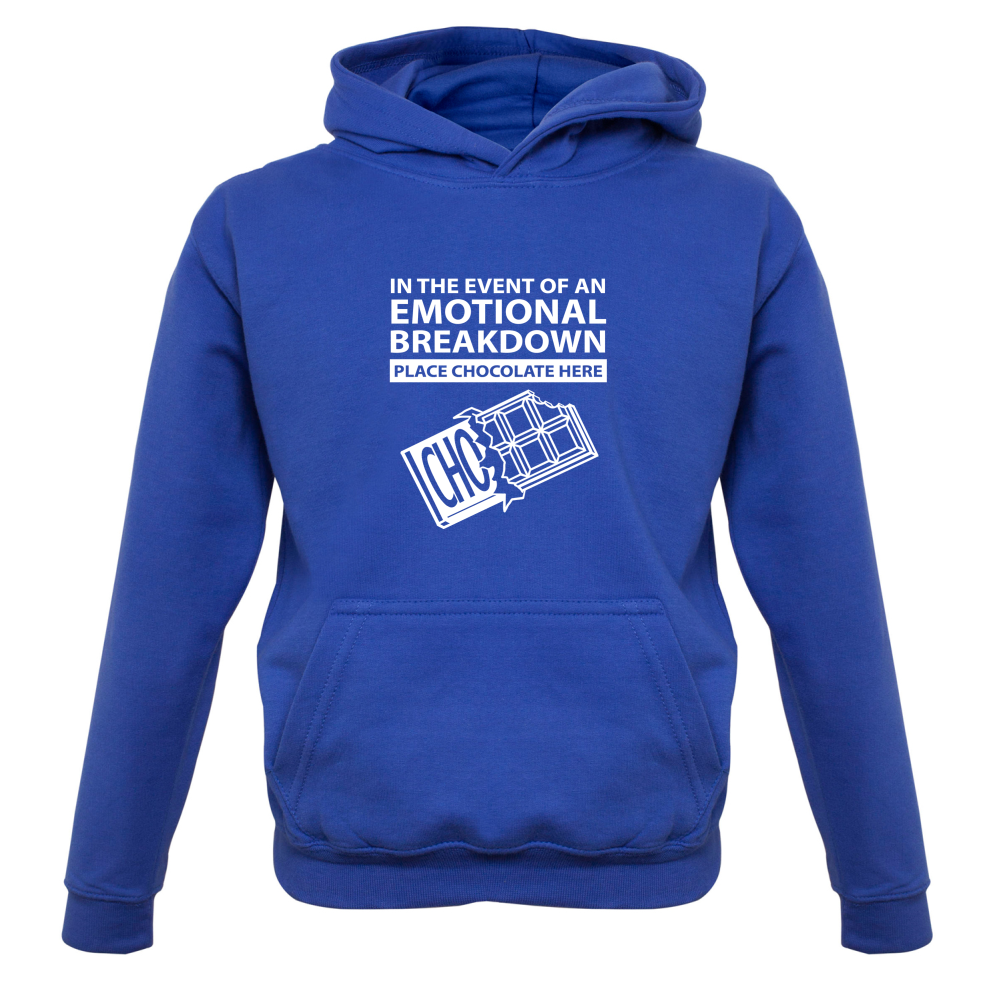 Kids Hoodie: Our kids unisex style Emotional Breadown Place Chocolate Here Hoodie is printed on our 300 GSM kangaroo pocket hooded top and is available on 7 different Colours.