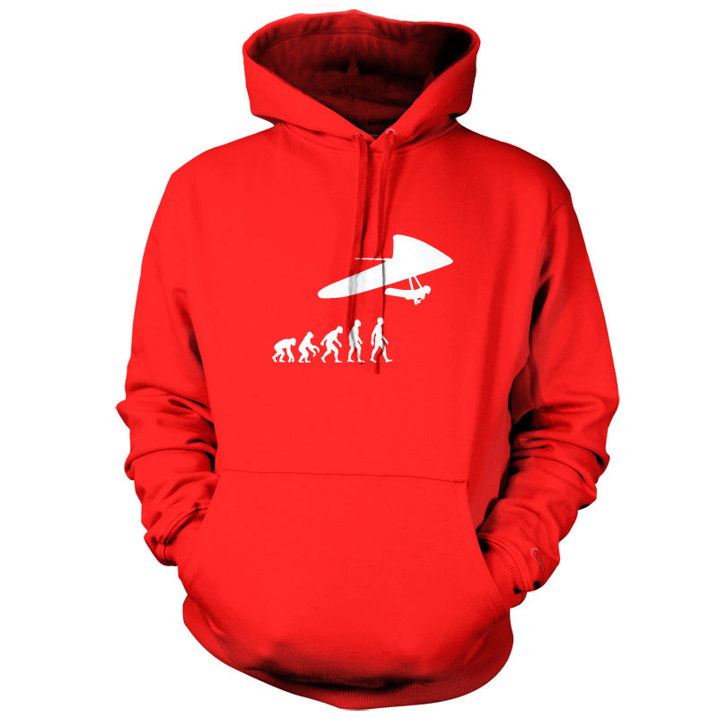 Unisex Hoodie, Our unisex style Evolution Of Man Hang Glider Hooded top is printed on our 280 GSM kangaroo pocket garment and is Available in 9 Colours and with sizes Small to XXL.