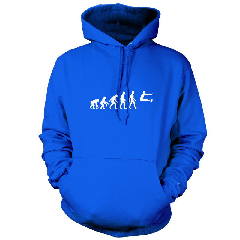 Unisex Hoodie, Our unisex style Evolution Of Man Long Jump Hooded top is printed on our 280 GSM kangaroo pocket garment and is Available in 9 Colours and with sizes Small to XXL.