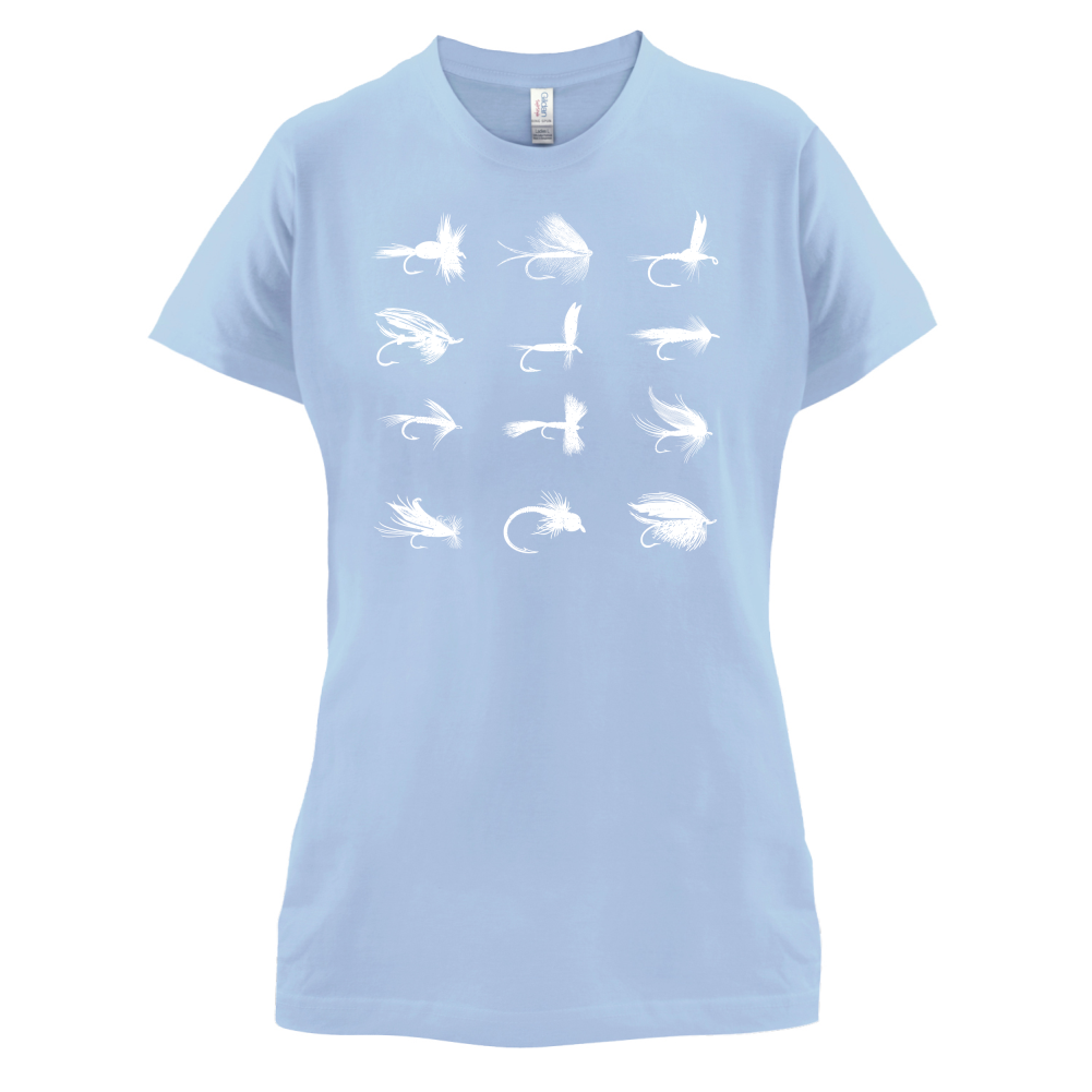 Women's Slim fit T-shirt, our ladies fly Fishing Flies t-shirt is printed on our popular 150 GSM ring spun womens garment. Available in 11 colours and from Size Small to XXL.