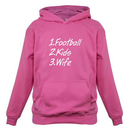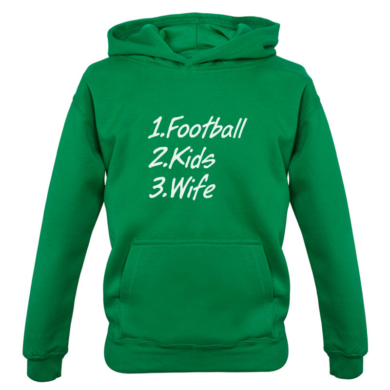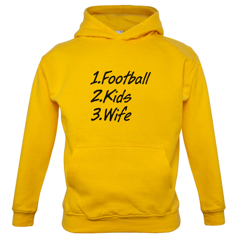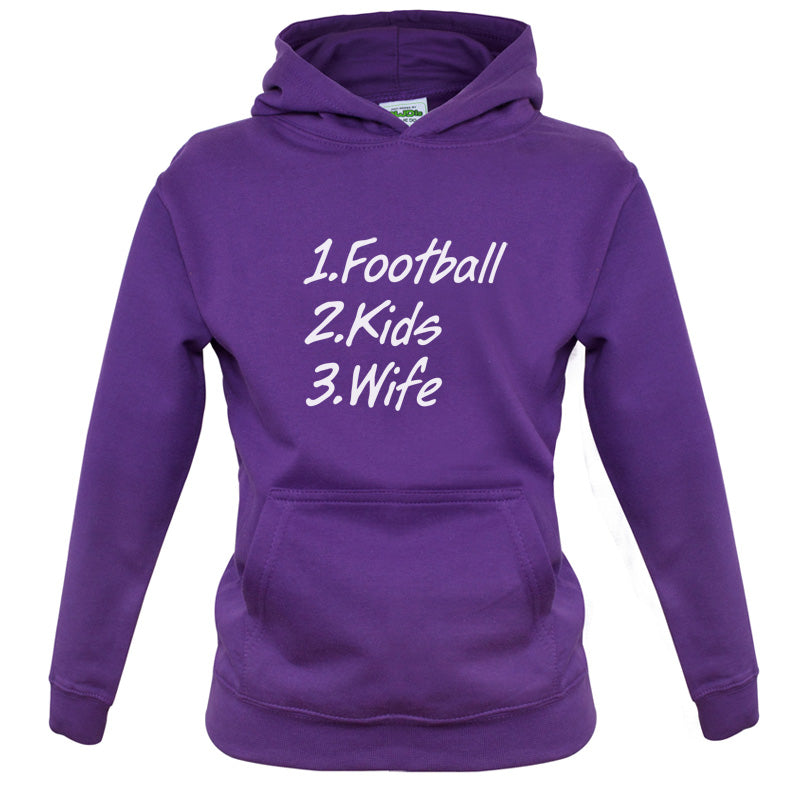 Kids Hoodie: Our kids unisex style Football Kids Wife Hoodie is printed on our 300 GSM kangaroo pocket hooded top and is available on 7 different Colours.