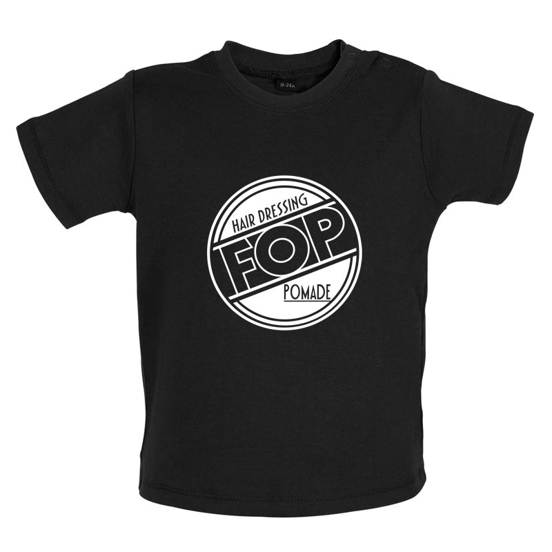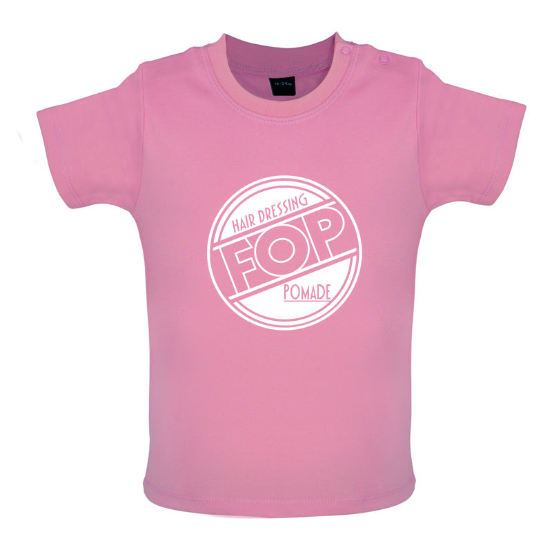 Baby/Toddler T-shirt: Our Baby Unisex style FOP Hair dressing Pomade T-shirt is printed on our high quality 200 gsm ringspun cotton garment which features shoulder poppers to ease getting your little one dressed. Our Baby T-shirts are available in a choice of Eight colours.