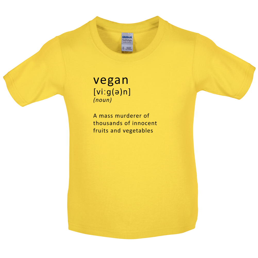 Kids T-shirt: Our Kid's Unisex style Funny Definition Vegan T-shirt is printed on our 150 GSM ringspun cotton garment and is available on 8 different colours.