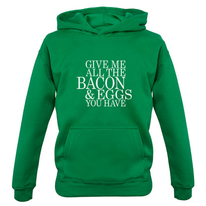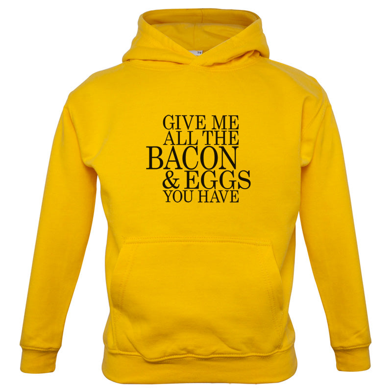 Kids Hoodie: Our kids unisex style Give Me All The Bacon And Eggs You Have Hoodie is printed on our 300 GSM kangaroo pocket hooded top and is available on 7 different Colours.