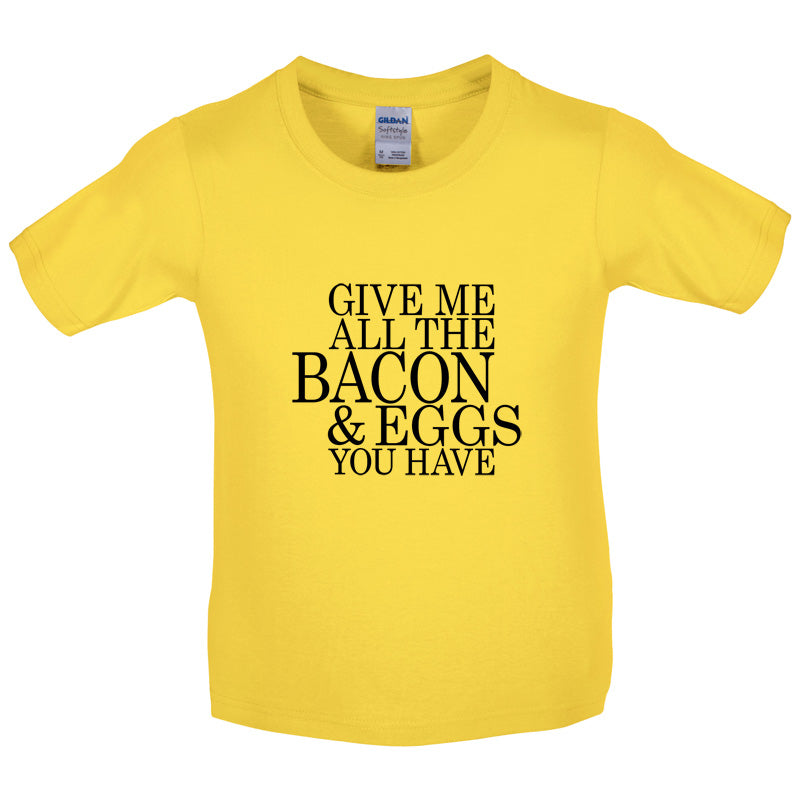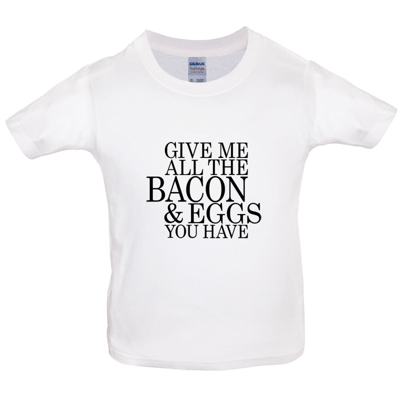 Kids T-shirt: Our Kid's Unisex style Give Me All The Bacon And Eggs You Have T-shirt is printed on our 150 GSM ringspun cotton garment and is available on 8 different colours.