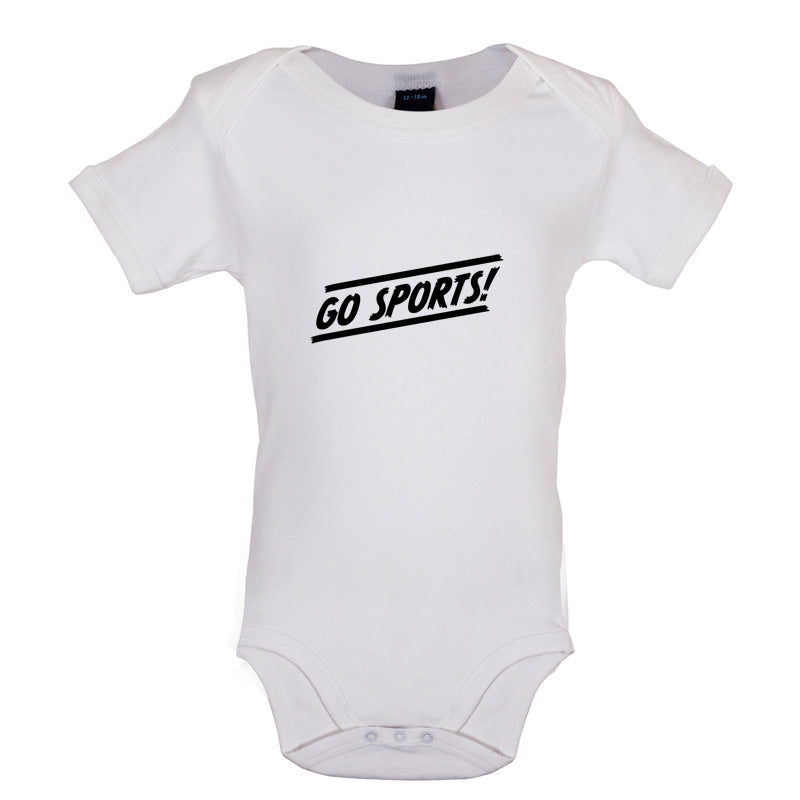 Babygrow/Bodysuit: Our Baby unisex style Go Sports Babygrow is printed on our 200 GSM short sleeve bodysuit and is available in a choice of 6 different Colours.