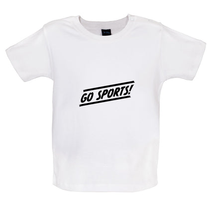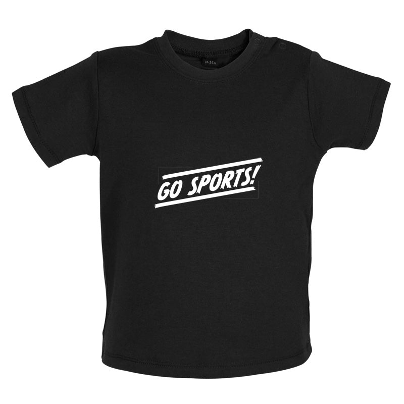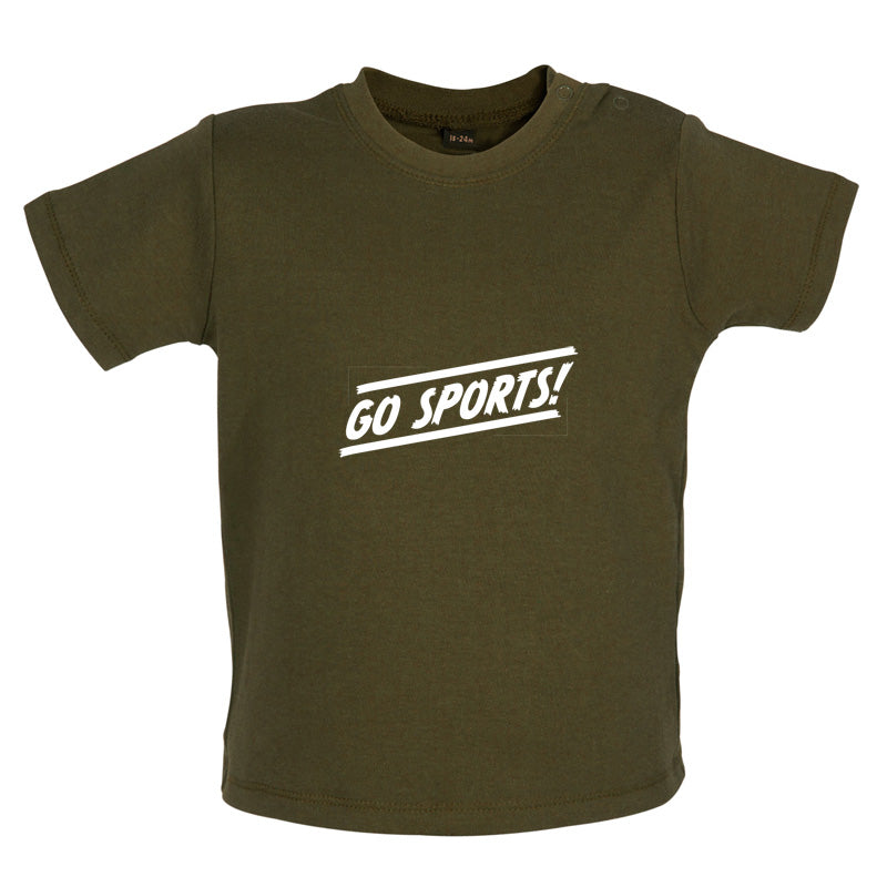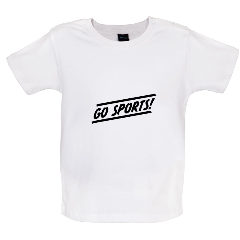 Baby/Toddler T-shirt: Our Baby Unisex style Go Sports T-shirt is printed on our high quality 200 gsm ringspun cotton garment which features shoulder poppers to ease getting your little one dressed. Our Baby T-shirts are available in a choice of Eight colours.