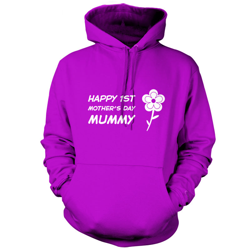 Unisex Hoodie, Our unisex style Happy 1st Mothers Day Mummy - Flower Hooded top is printed on our 280 GSM kangaroo pocket garment and is Available in 9 Colours and with sizes Small to XXL.