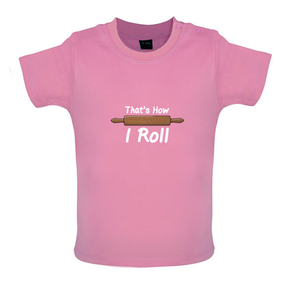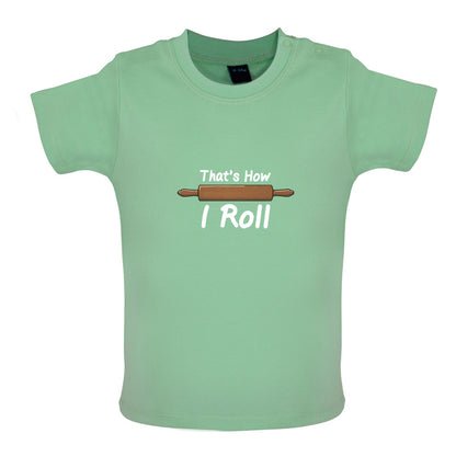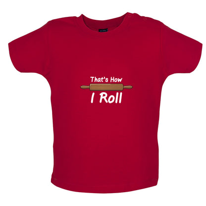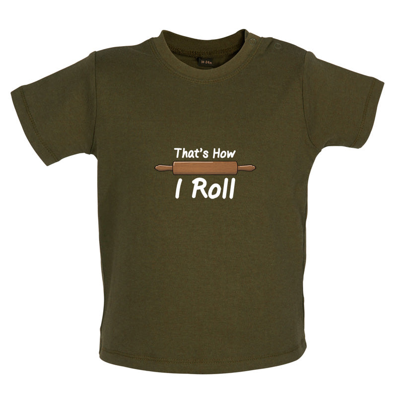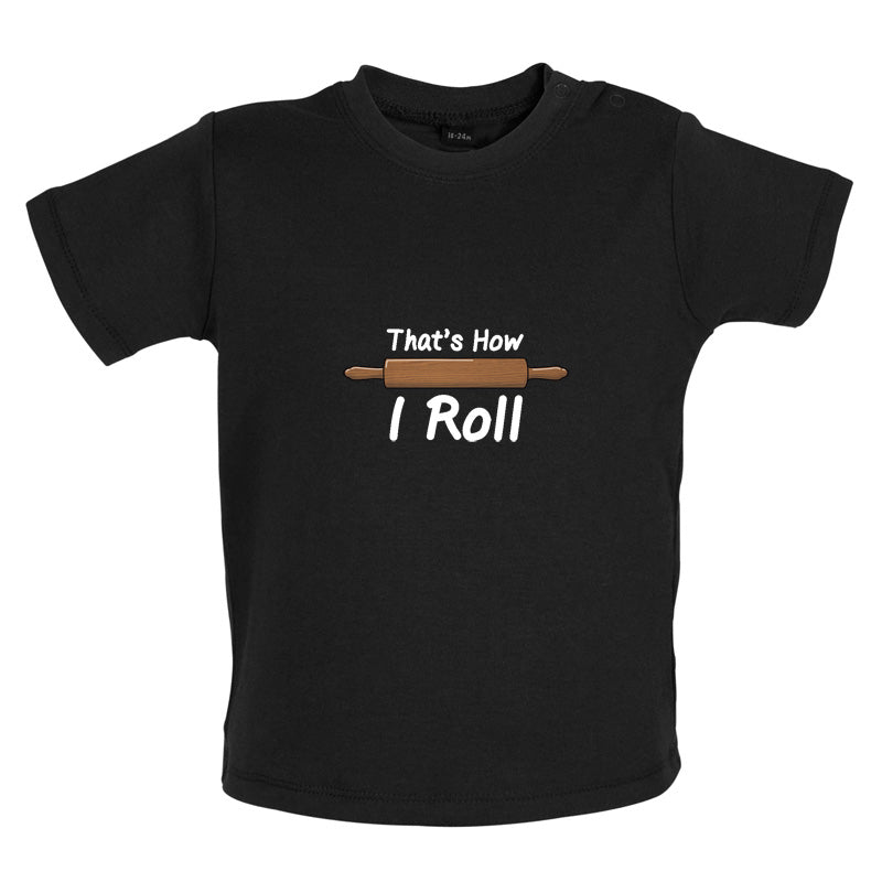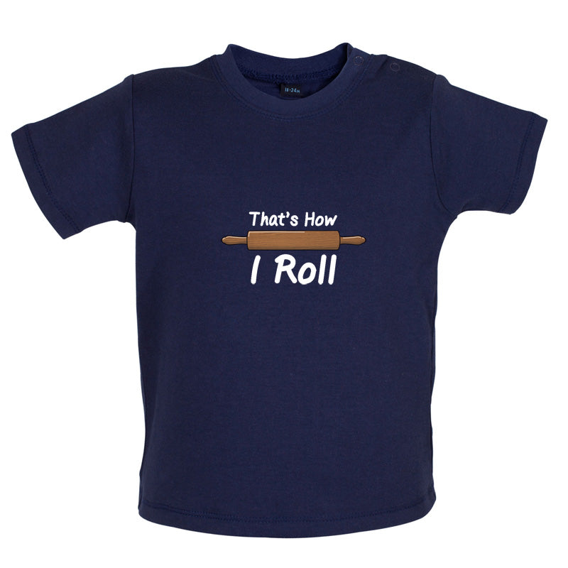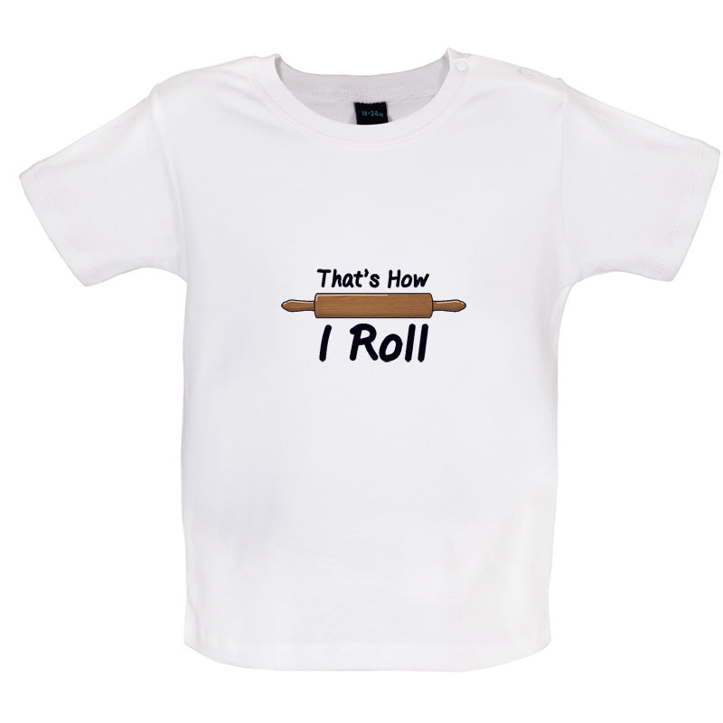 Baby/Toddler T-shirt: Our Baby Unisex style How I Roll Rolling Pin T-shirt is printed on our high quality 200 gsm ringspun cotton garment which features shoulder poppers to ease getting your little one dressed. Our Baby T-shirts are available in a choice of Eight colours.