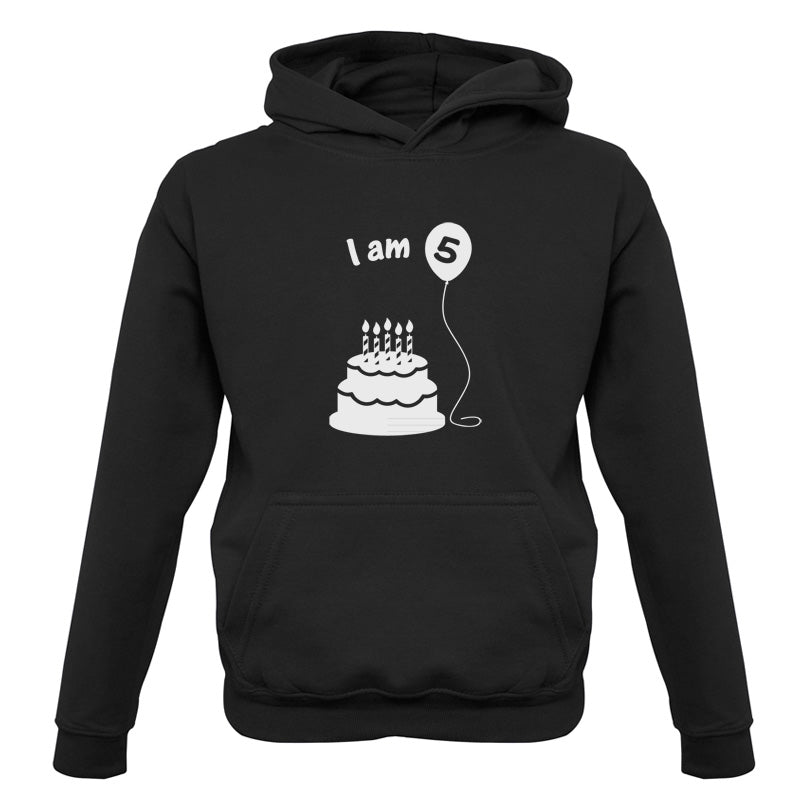 Kids Hoodie: Our kids unisex style I Am 5 (Birthday) Hoodie is printed on our 300 GSM kangaroo pocket hooded top and is available on 7 different Colours.