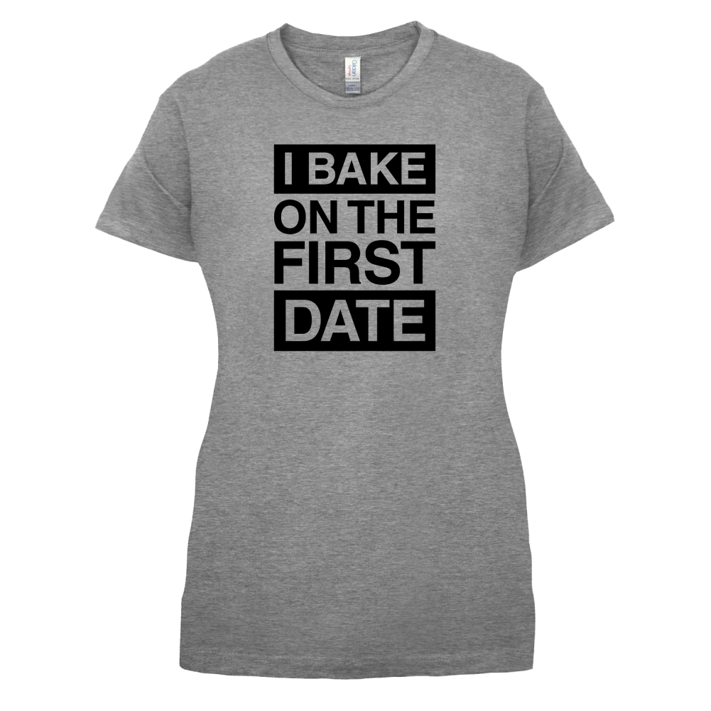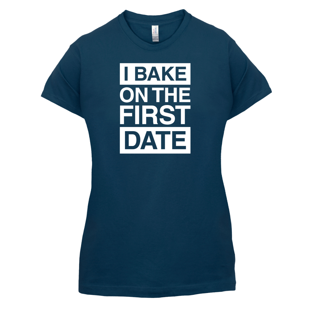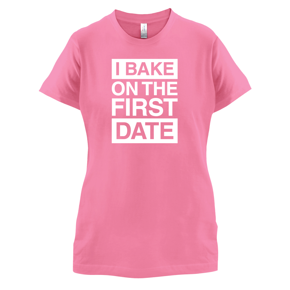 Women's Slim fit T-shirt, our ladies I Bake on the First Date t-shirt is printed on our popular 150 GSM ring spun womens garment. Available in 11 colours and from Size Small to XXL.