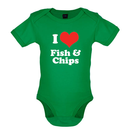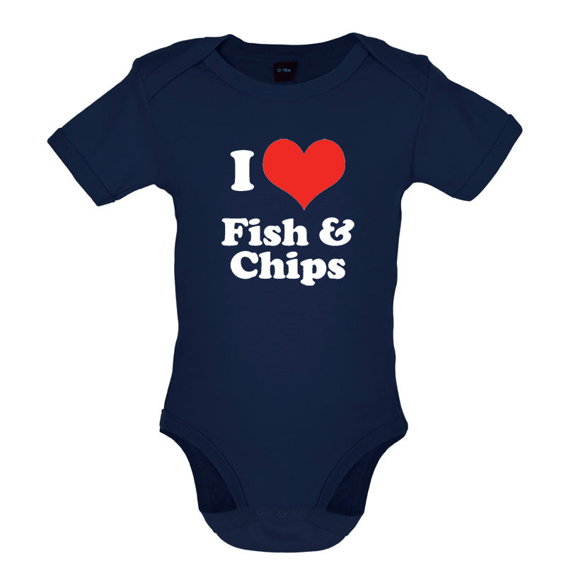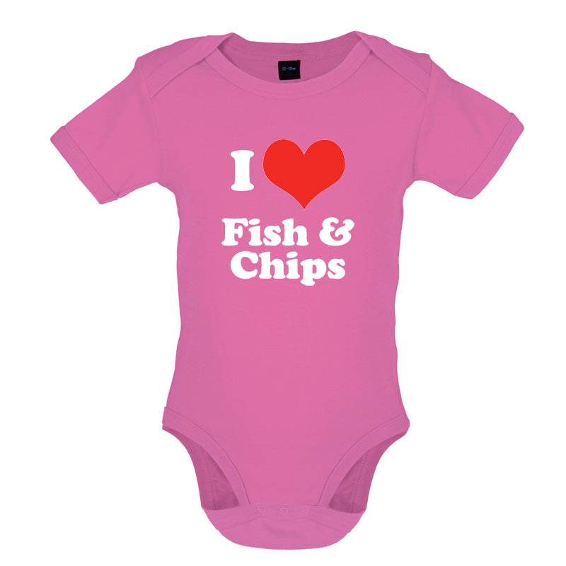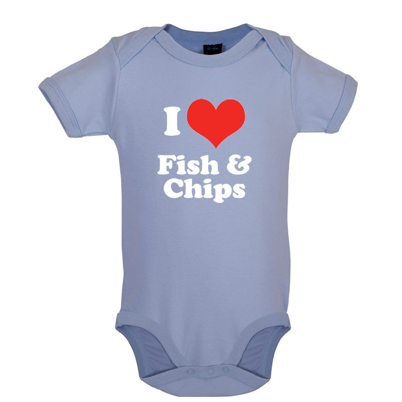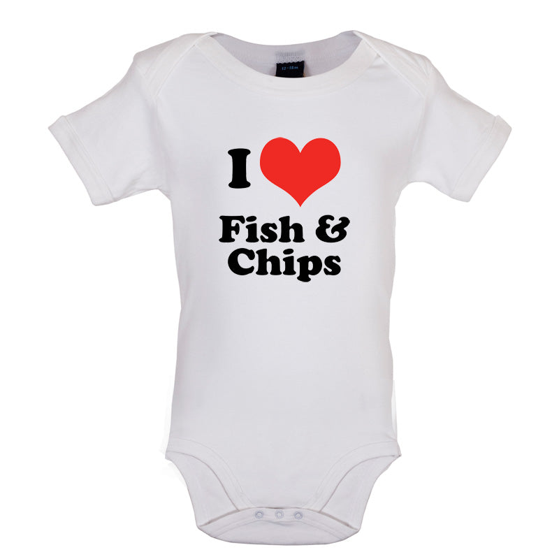 Babygrow/Bodysuit: Our Baby unisex style I Love Fish & Chips Babygrow is printed on our 200 GSM short sleeve bodysuit and is available in a choice of 6 different Colours.