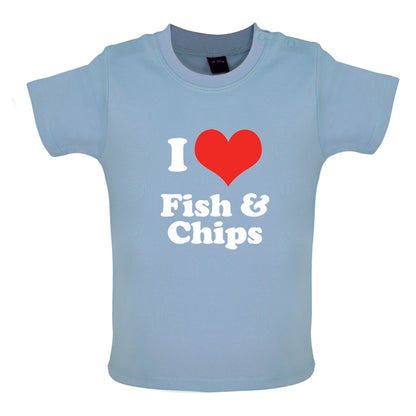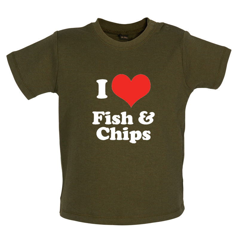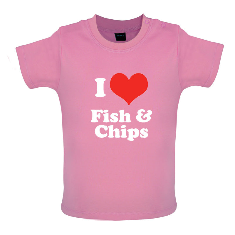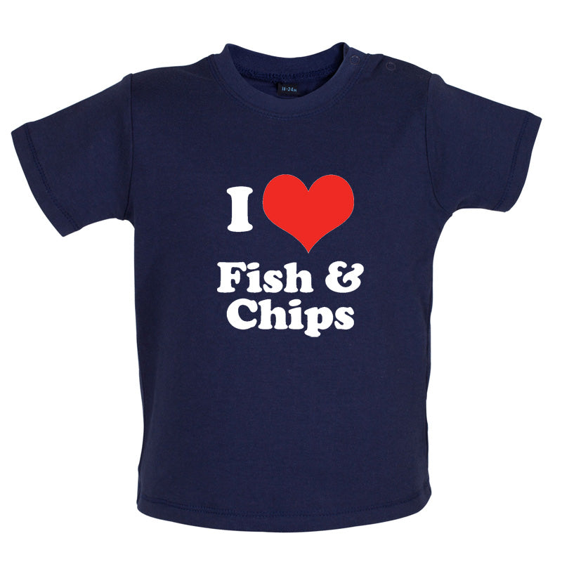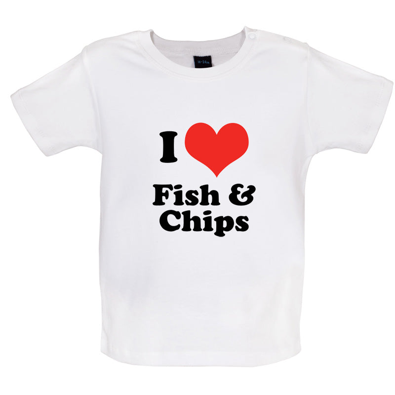 Baby/Toddler T-shirt: Our Baby Unisex style I Love Fish & Chips T-shirt is printed on our high quality 200 gsm ringspun cotton garment which features shoulder poppers to ease getting your little one dressed. Our Baby T-shirts are available in a choice of Eight colours.