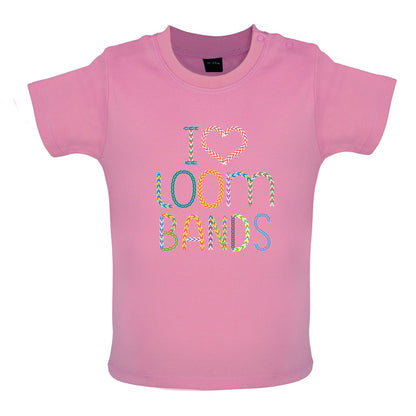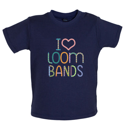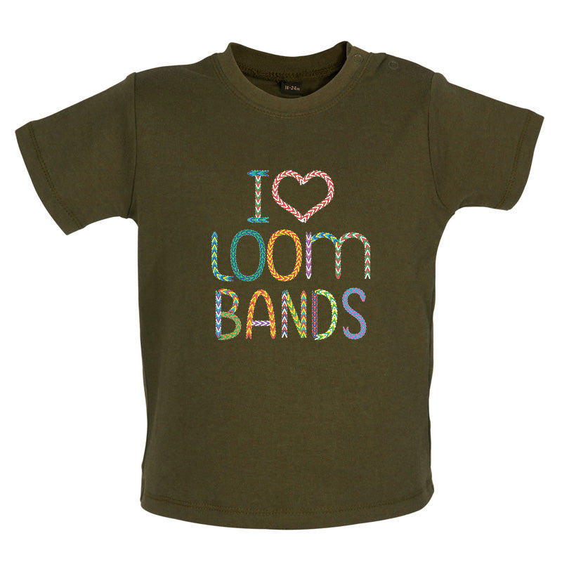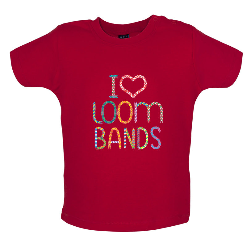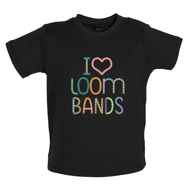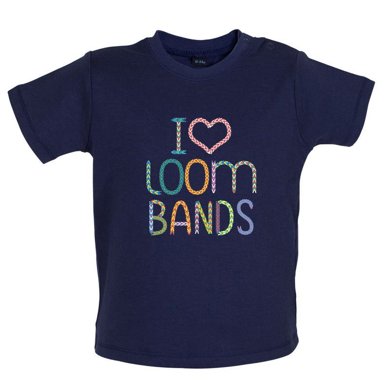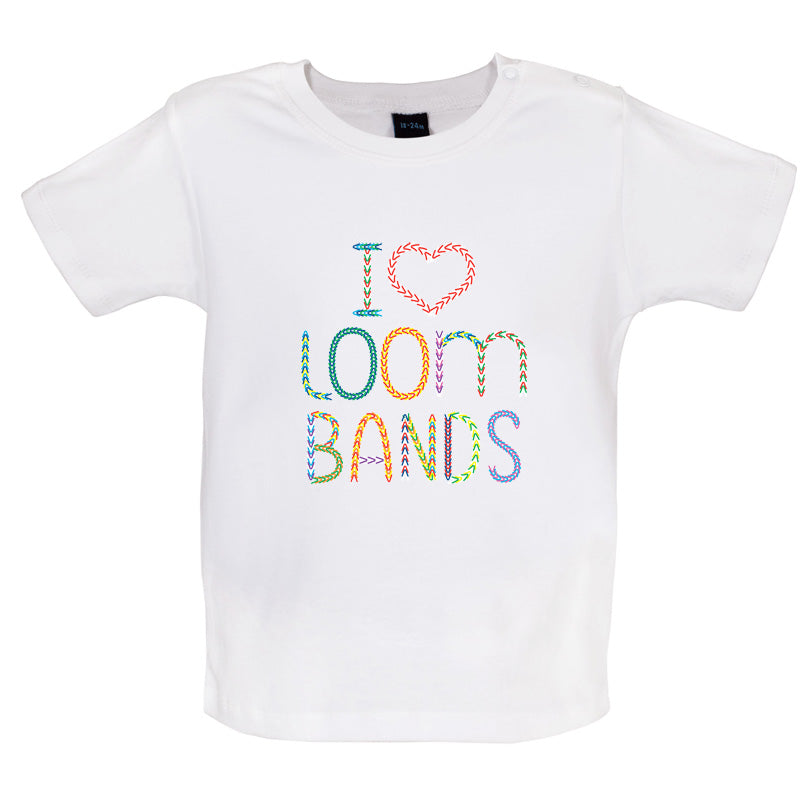 Baby/Toddler T-shirt: Our Baby Unisex style I Love Loom Bands T-shirt is printed on our high quality 200 gsm ringspun cotton garment which features shoulder poppers to ease getting your little one dressed. Our Baby T-shirts are available in a choice of Eight colours.