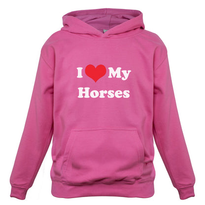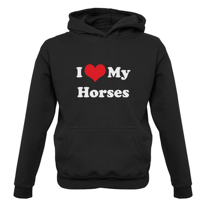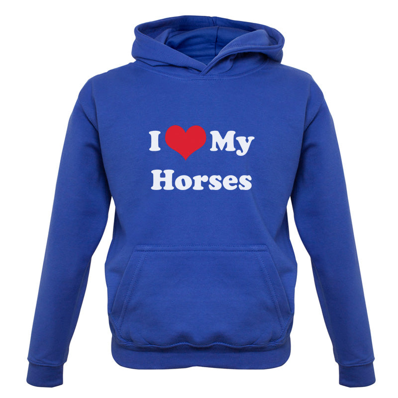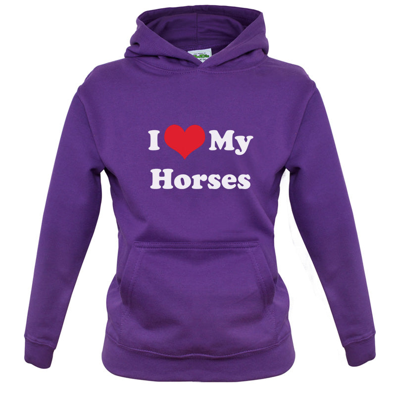 Kids Hoodie: Our kids unisex style I Love My Horses Hoodie is printed on our 300 GSM kangaroo pocket hooded top and is available on 7 different Colours.