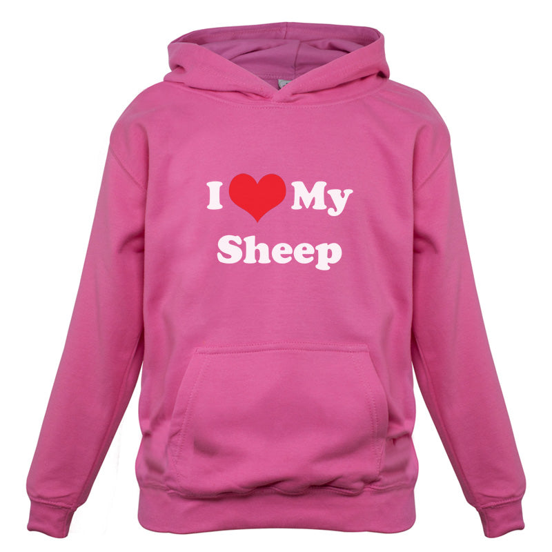 Kids Hoodie: Our kids unisex style I Love My Sheep Hoodie is printed on our 300 GSM kangaroo pocket hooded top and is available on 7 different Colours.