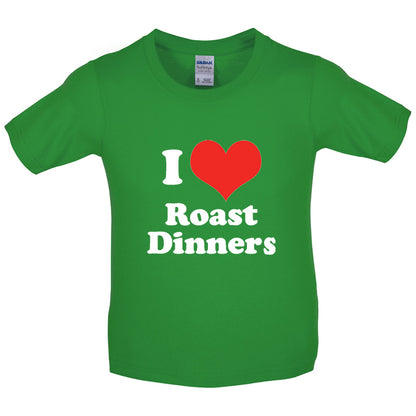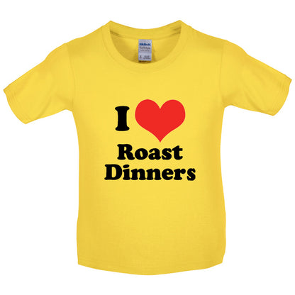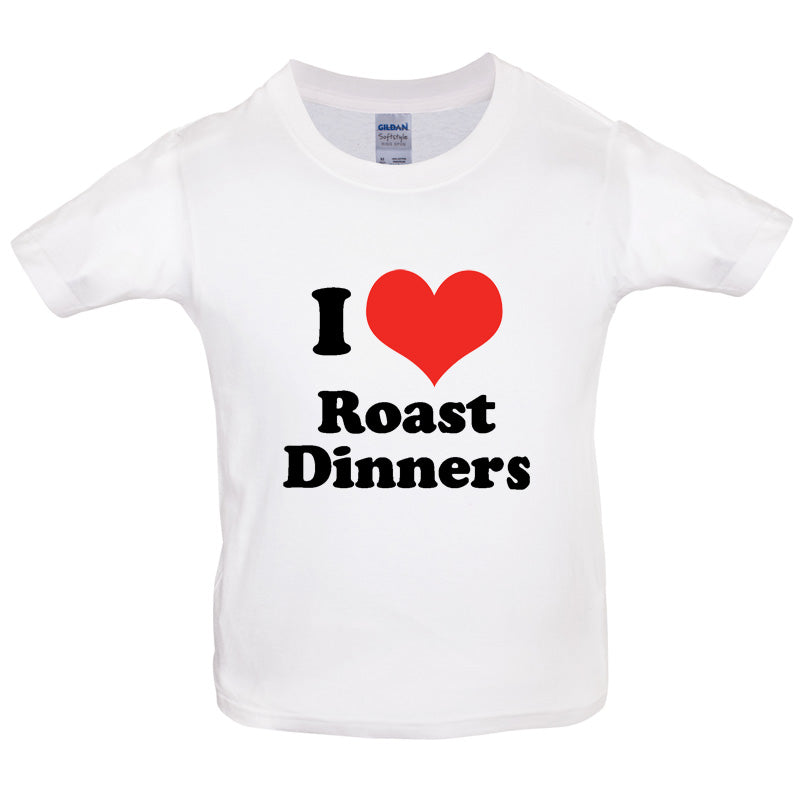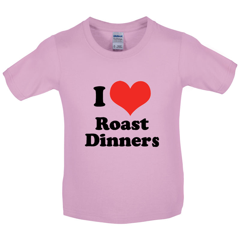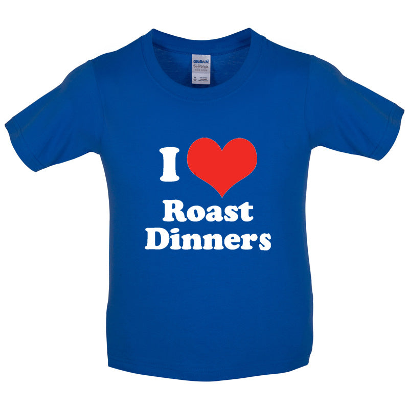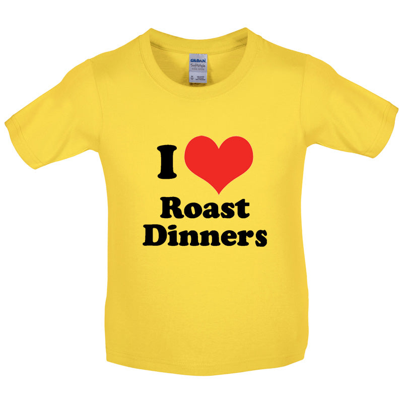 Kids T-shirt: Our Kid's Unisex style I Love Roast Dinners T-shirt is printed on our 150 GSM ringspun cotton garment and is available on 8 different colours.
