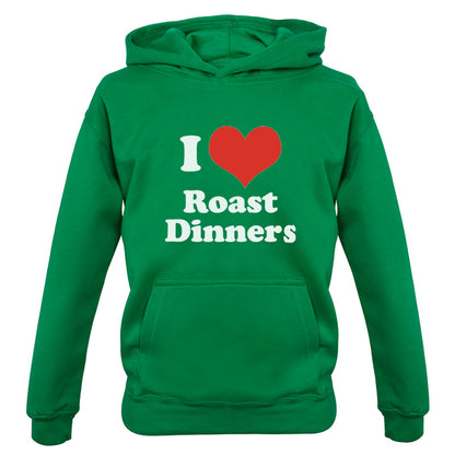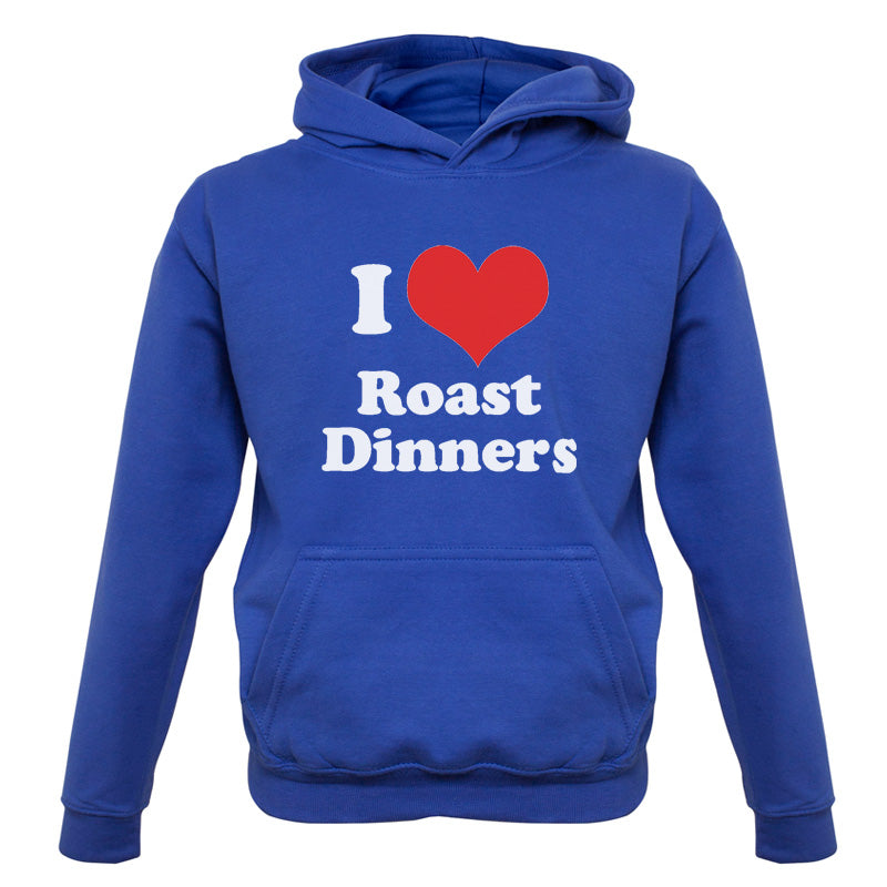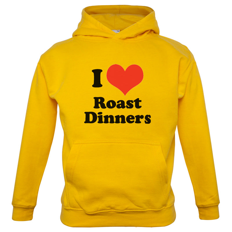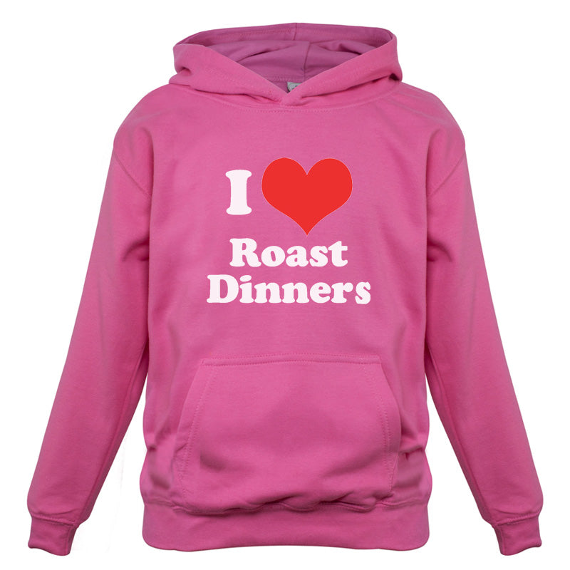 Kids Hoodie: Our kids unisex style I Love Roast Dinners Hoodie is printed on our 300 GSM kangaroo pocket hooded top and is available on 7 different Colours.