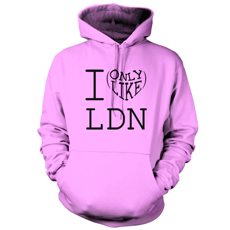 Unisex Hoodie, Our unisex style I Only Like LDN Hooded top is printed on our 280 GSM kangaroo pocket garment and is Available in 9 Colours and with sizes Small to XXL.