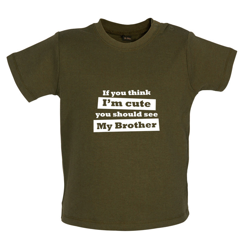 Baby/Toddler T-shirt: Our Baby Unisex style If You Think I'm Cute You Should See My Brother T-shirt is printed on our high quality 200 gsm ringspun cotton garment which features shoulder poppers to ease getting your little one dressed. Our Baby T-shirts are available in a choice of Eight colours.