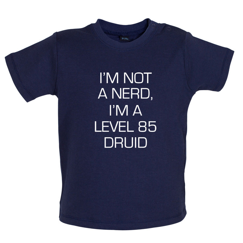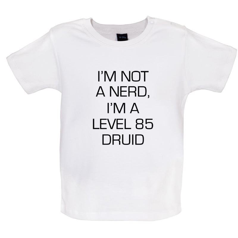 Baby/Toddler T-shirt: Our Baby Unisex style I'm Not A Nerd, I'm A Level 85 Druid T-shirt is printed on our high quality 200 gsm ringspun cotton garment which features shoulder poppers to ease getting your little one dressed. Our Baby T-shirts are available in a choice of Eight colours.