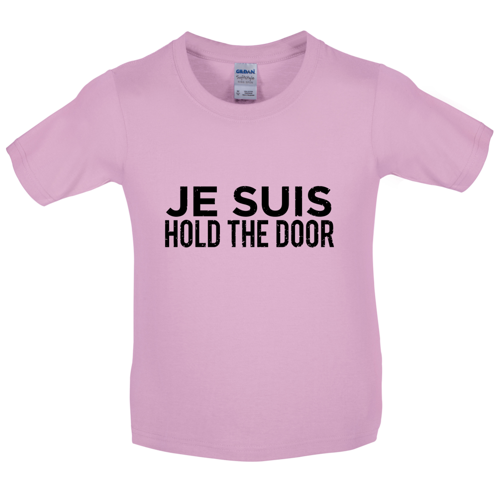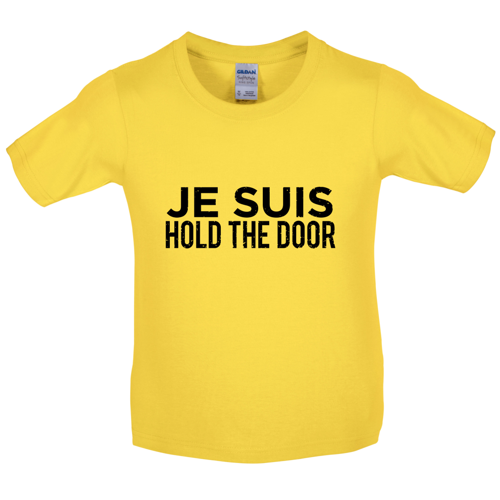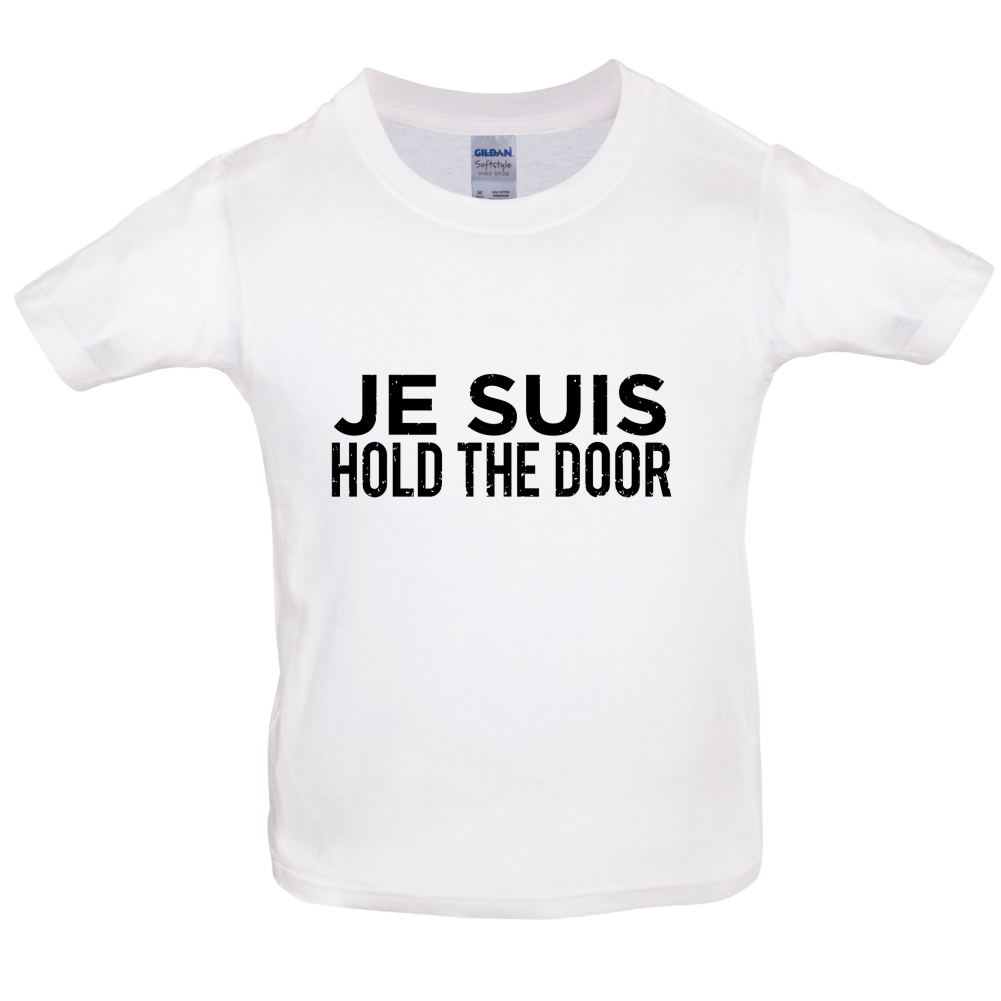 Kids T-shirt: Our Kid's Unisex style Je Suis Hold The Door T-shirt is printed on our 150 GSM ringspun cotton garment and is available on 8 different colours.
