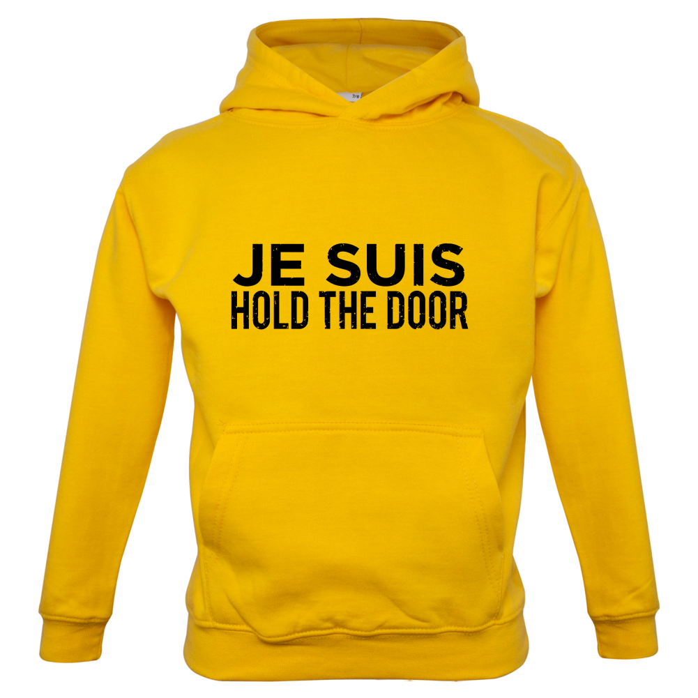 Kids Hoodie: Our kids unisex style Je Suis Hold The Door Hoodie is printed on our 300 GSM kangaroo pocket hooded top and is available on 7 different Colours.