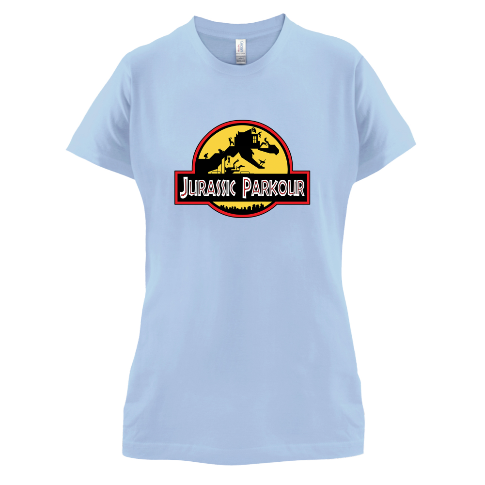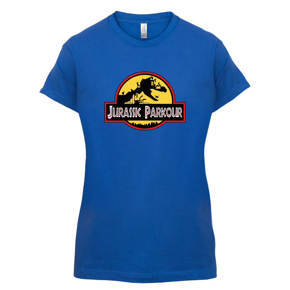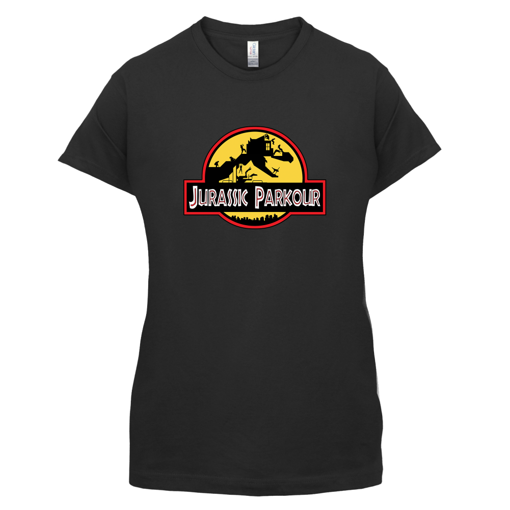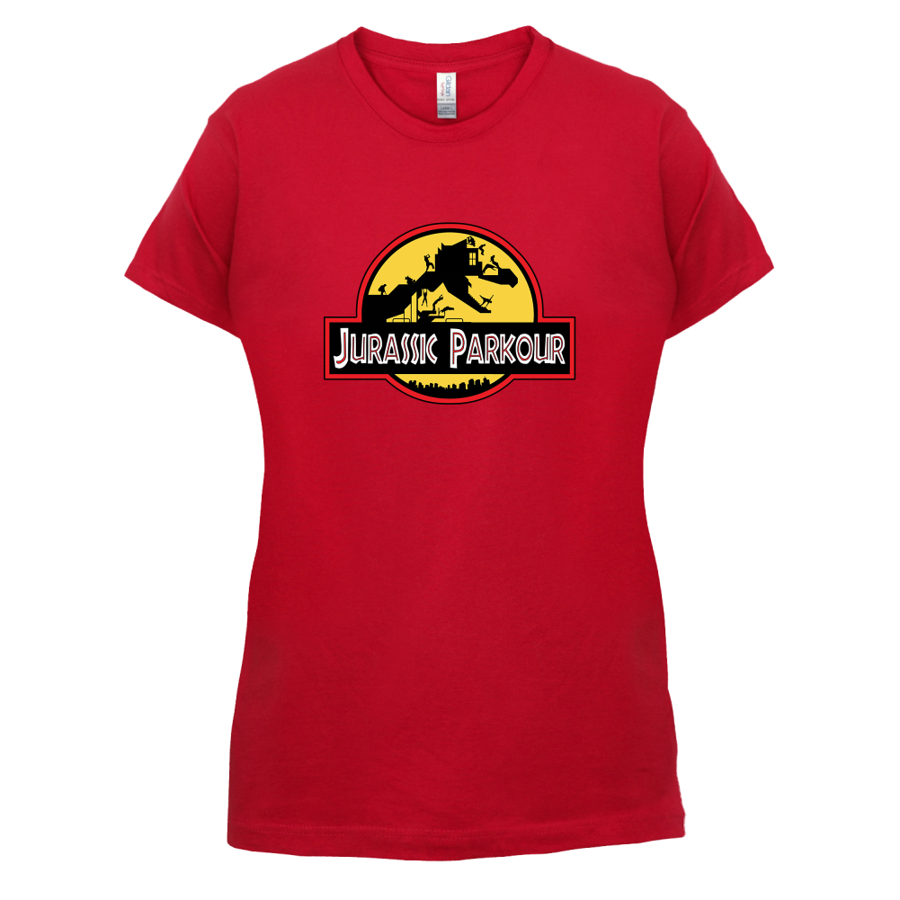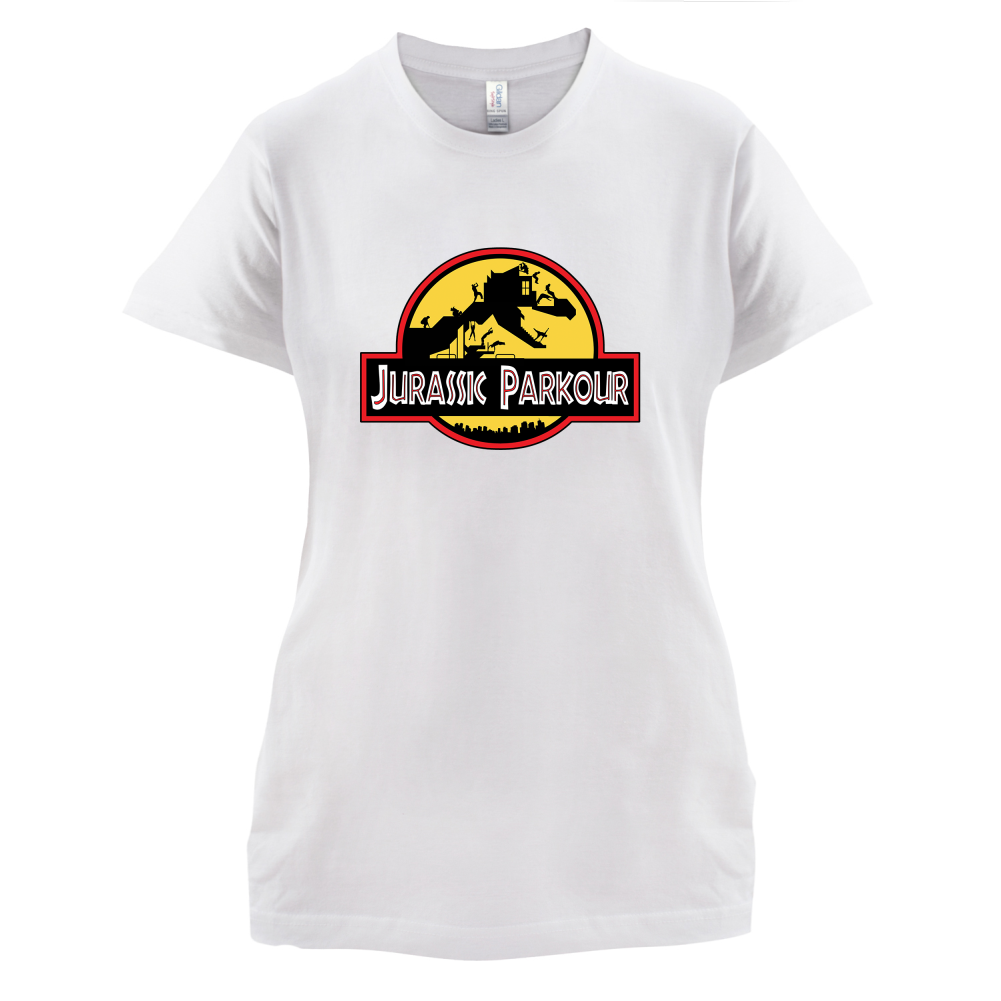 Women's Slim fit T-shirt, our ladies Jurassic Parkour t-shirt is printed on our popular 150 GSM ring spun womens garment. Available in 11 colours and from Size Small to XXL.