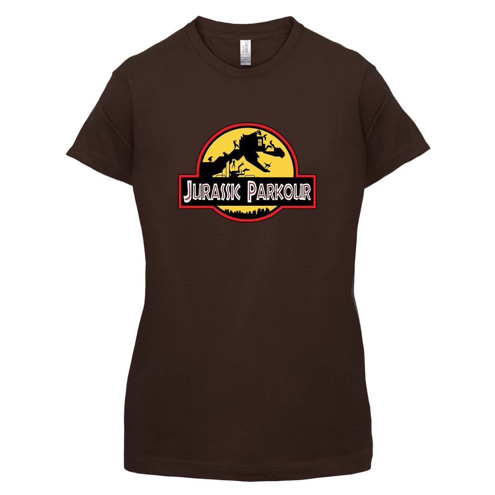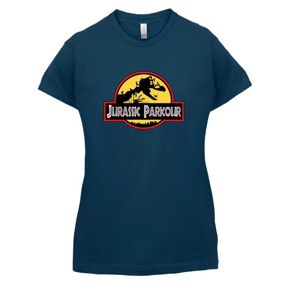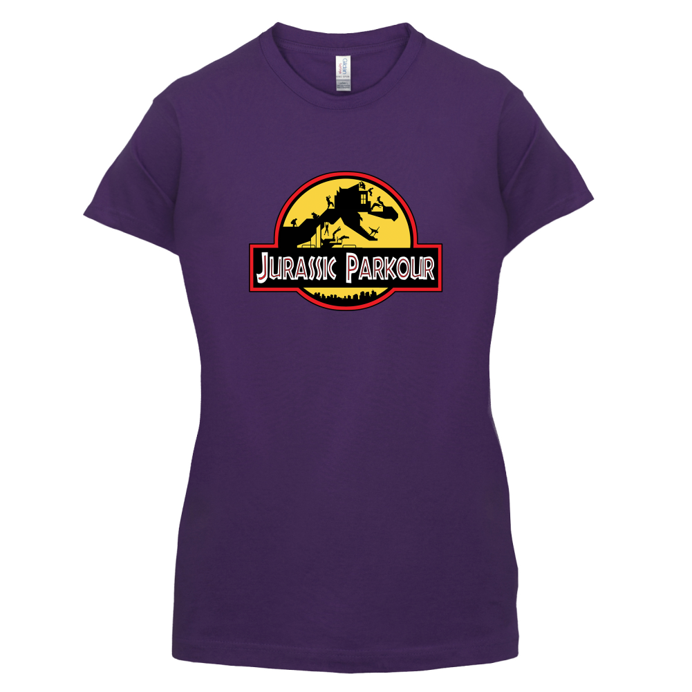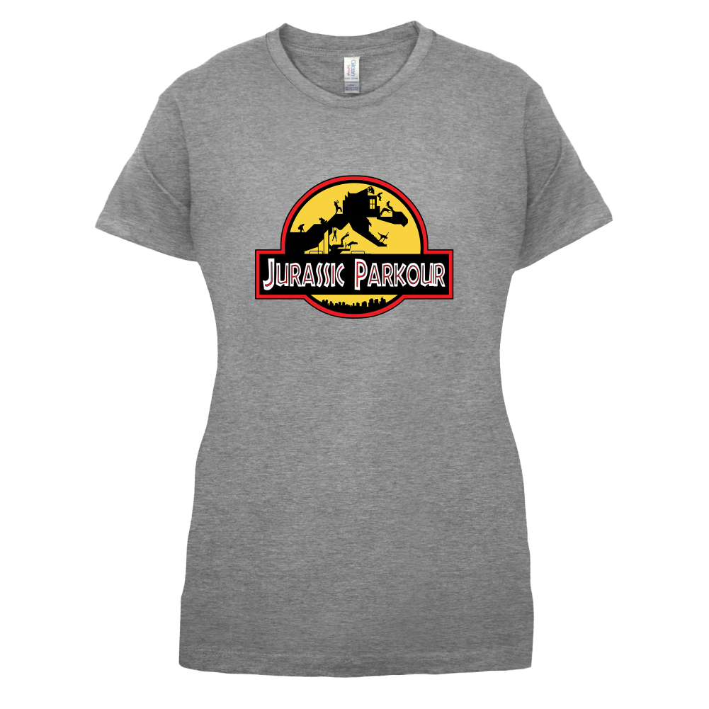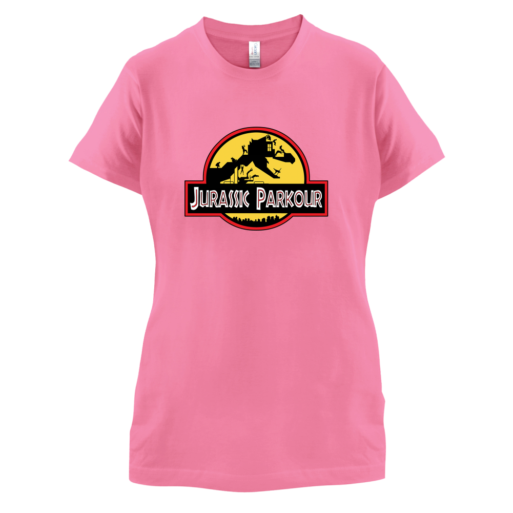 Women's Slim fit T-shirt, our ladies Jurassic Parkour t-shirt is printed on our popular 150 GSM ring spun womens garment. Available in 11 colours and from Size Small to XXL.