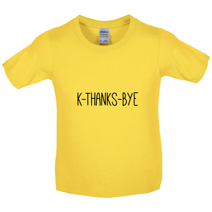 Kids T-shirt: Our Kid's Unisex style K Thanks Bye T-shirt is printed on our 150 GSM ringspun cotton garment and is available on 8 different colours.