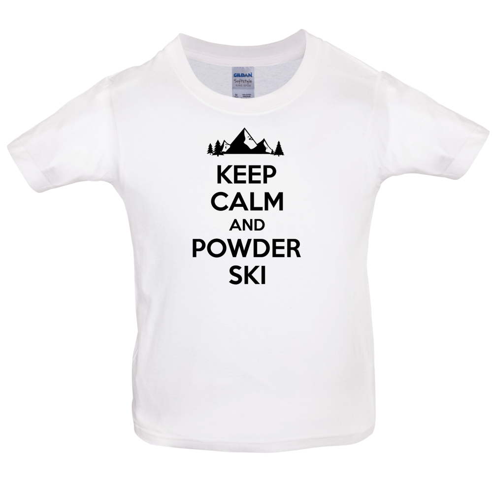 Kids T-shirt: Our Kid's Unisex style Keep Calm And Powder Ski T-shirt is printed on our 150 GSM ringspun cotton garment and is available on 8 different colours.