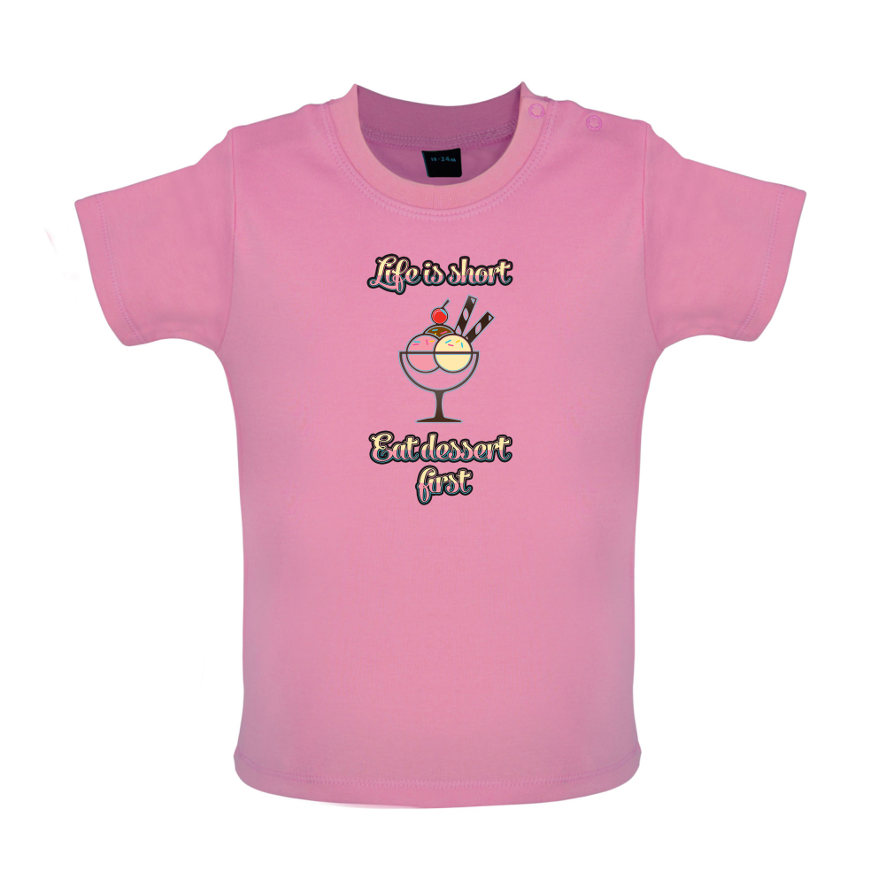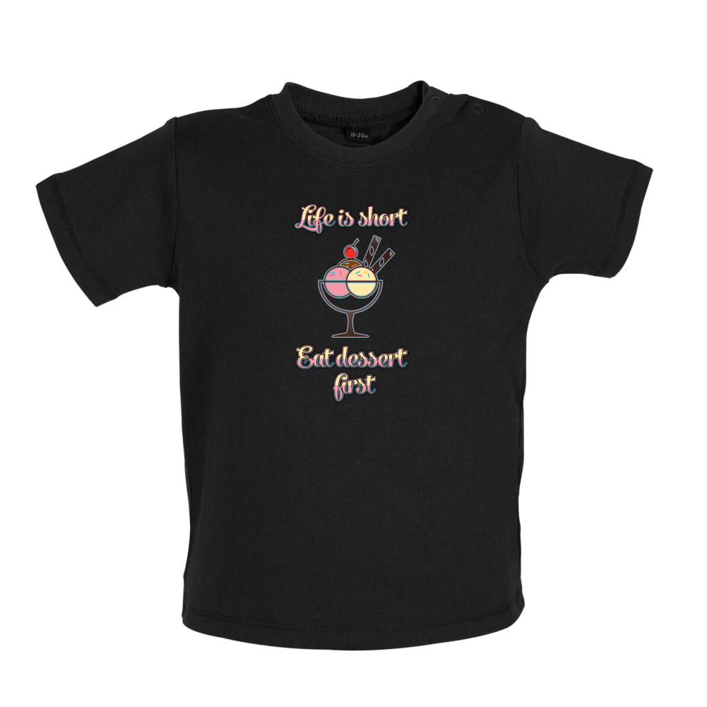 Baby/Toddler T-shirt: Our Baby Unisex style Life Is Short Eat Dessert First T-shirt is printed on our high quality 200 gsm ringspun cotton garment which features shoulder poppers to ease getting your little one dressed. Our Baby T-shirts are available in a choice of Eight colours.