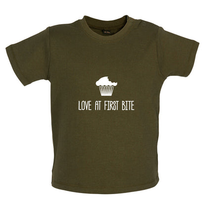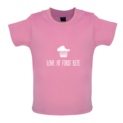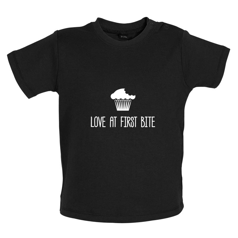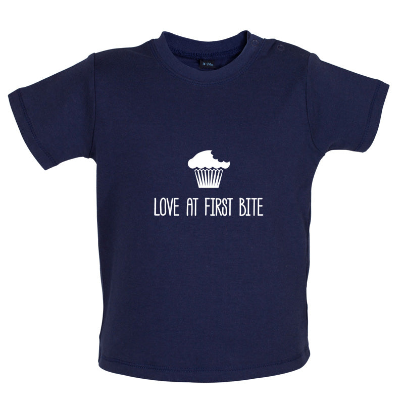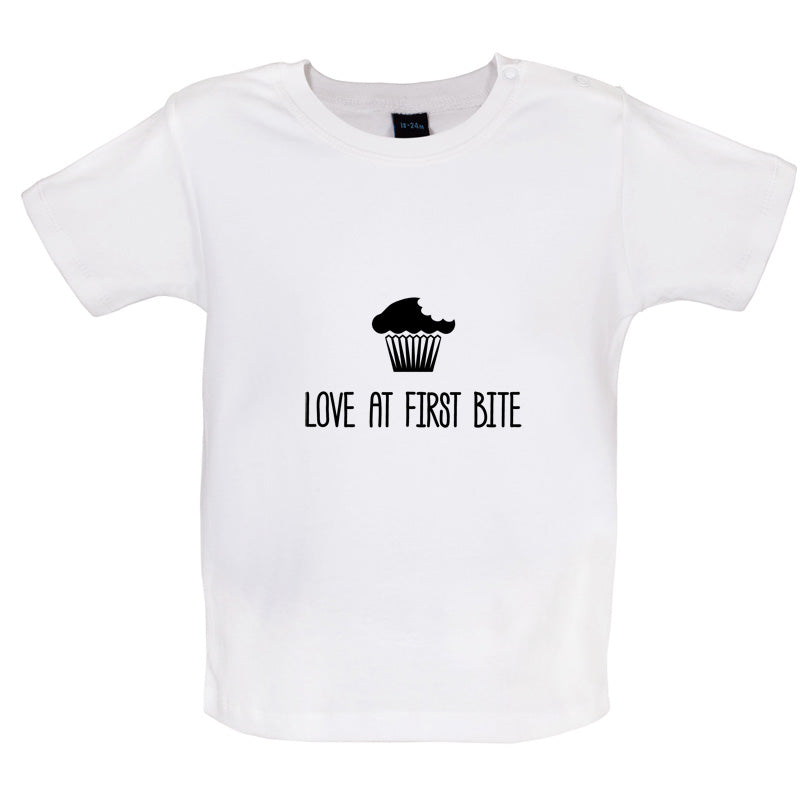 Baby/Toddler T-shirt: Our Baby Unisex style Love At First Bite T-shirt is printed on our high quality 200 gsm ringspun cotton garment which features shoulder poppers to ease getting your little one dressed. Our Baby T-shirts are available in a choice of Eight colours.