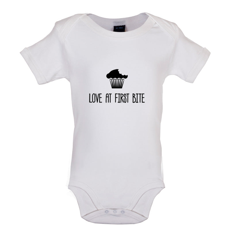 Babygrow/Bodysuit: Our Baby unisex style Love At First Bite Babygrow is printed on our 200 GSM short sleeve bodysuit and is available in a choice of 6 different Colours.