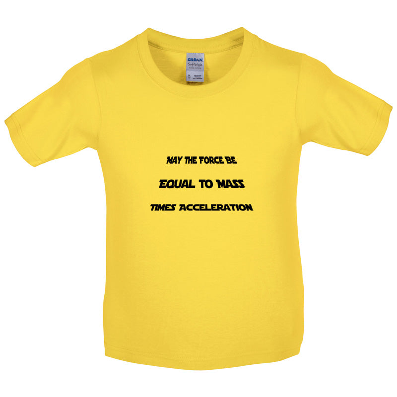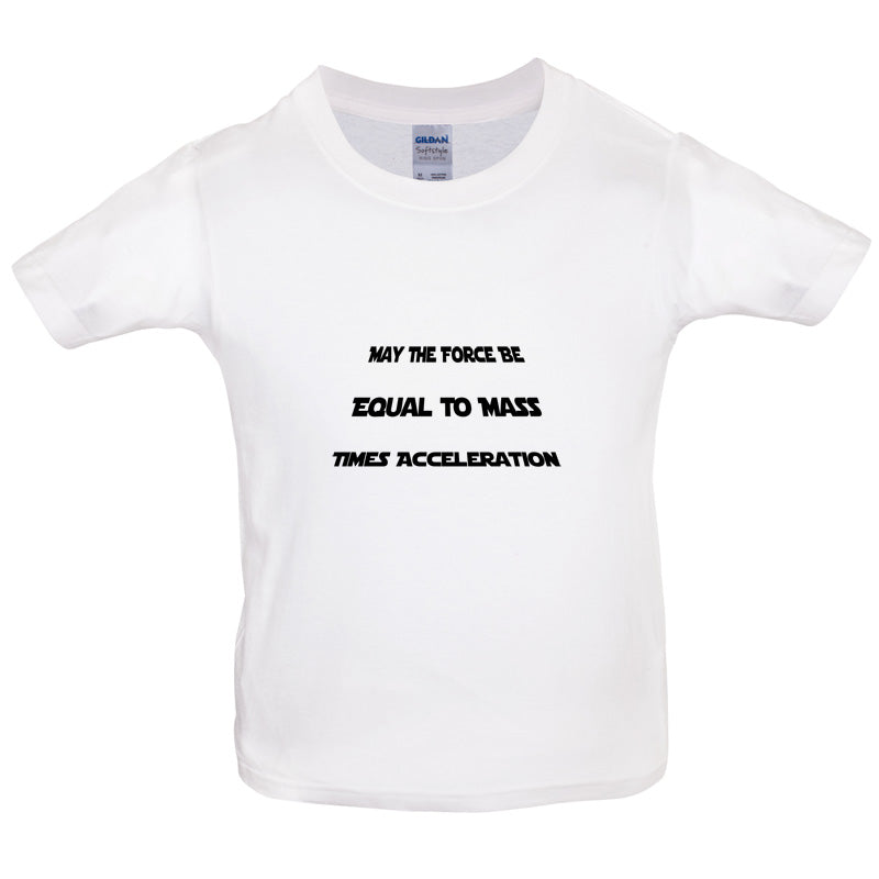 Kids T-shirt: Our Kid's Unisex style May the force be equal to mass times Acceleration T-shirt is printed on our 150 GSM ringspun cotton garment and is available on 8 different colours.