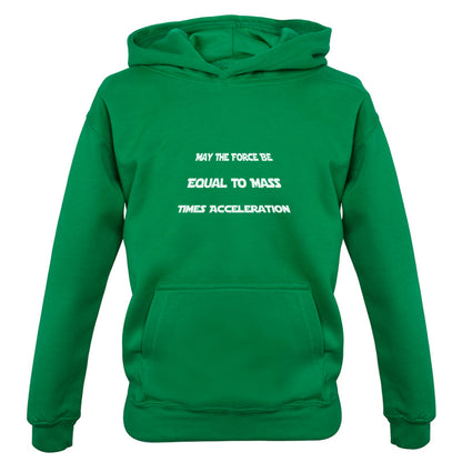 Kids Hoodie: Our kids unisex style May the force be equal to mass times Acceleration Hoodie is printed on our 300 GSM kangaroo pocket hooded top and is available on 7 different Colours.