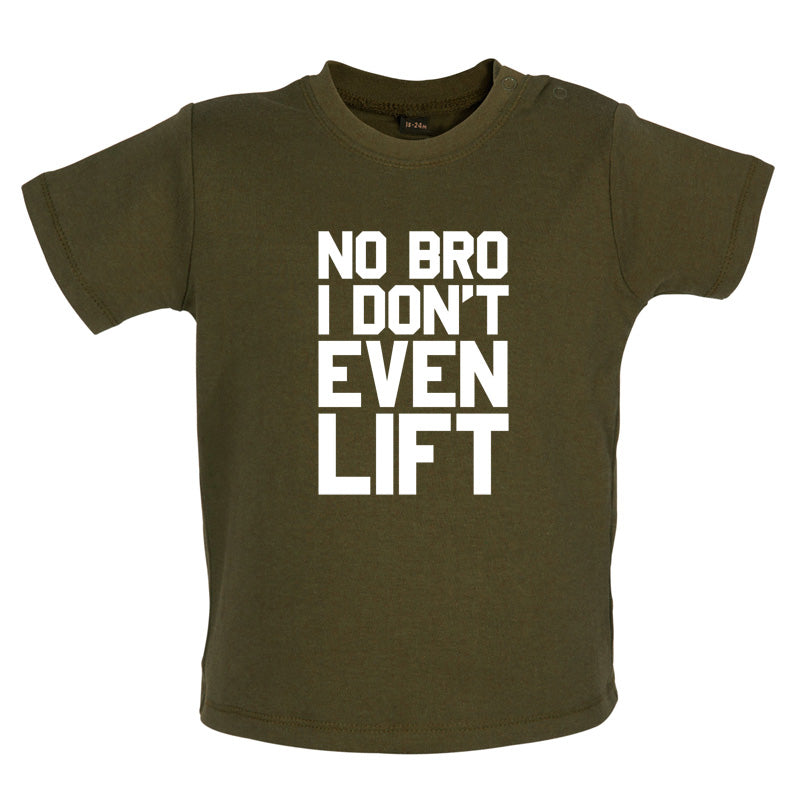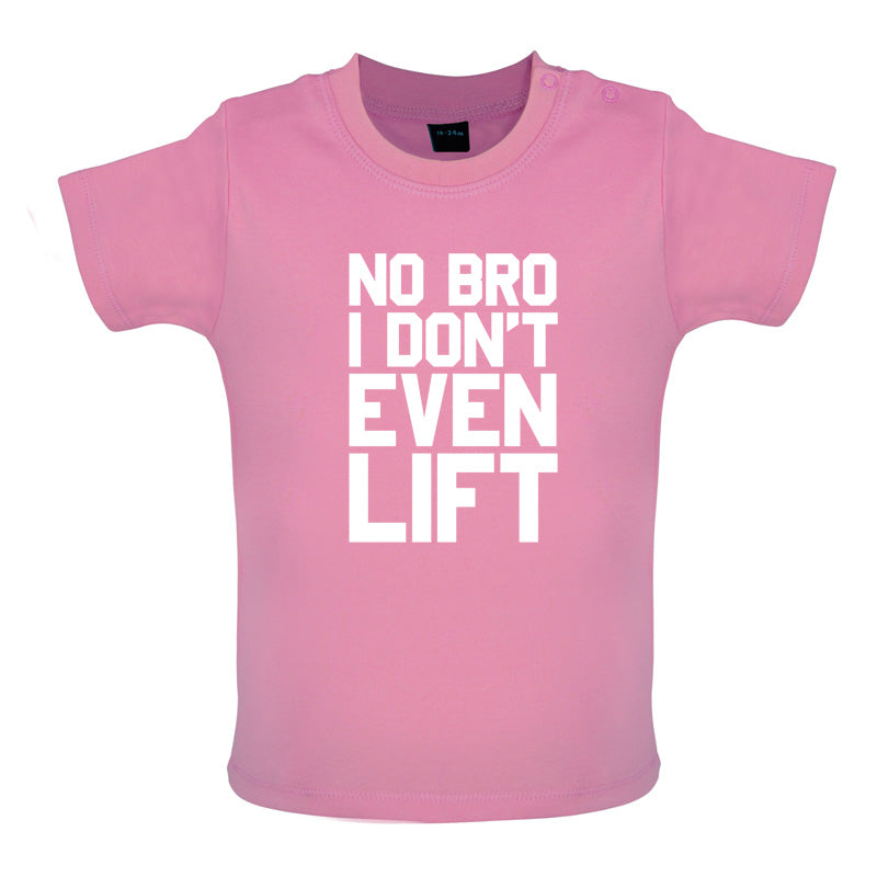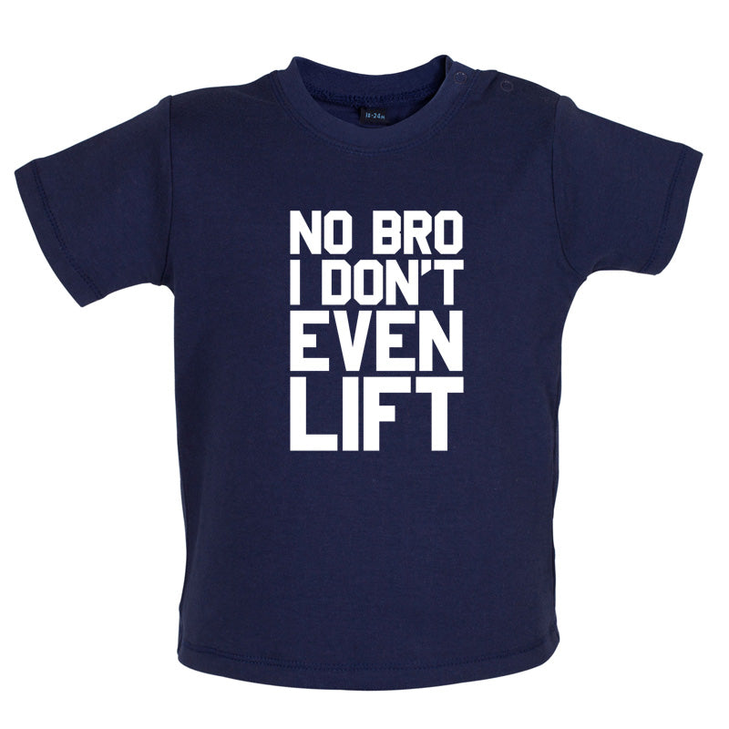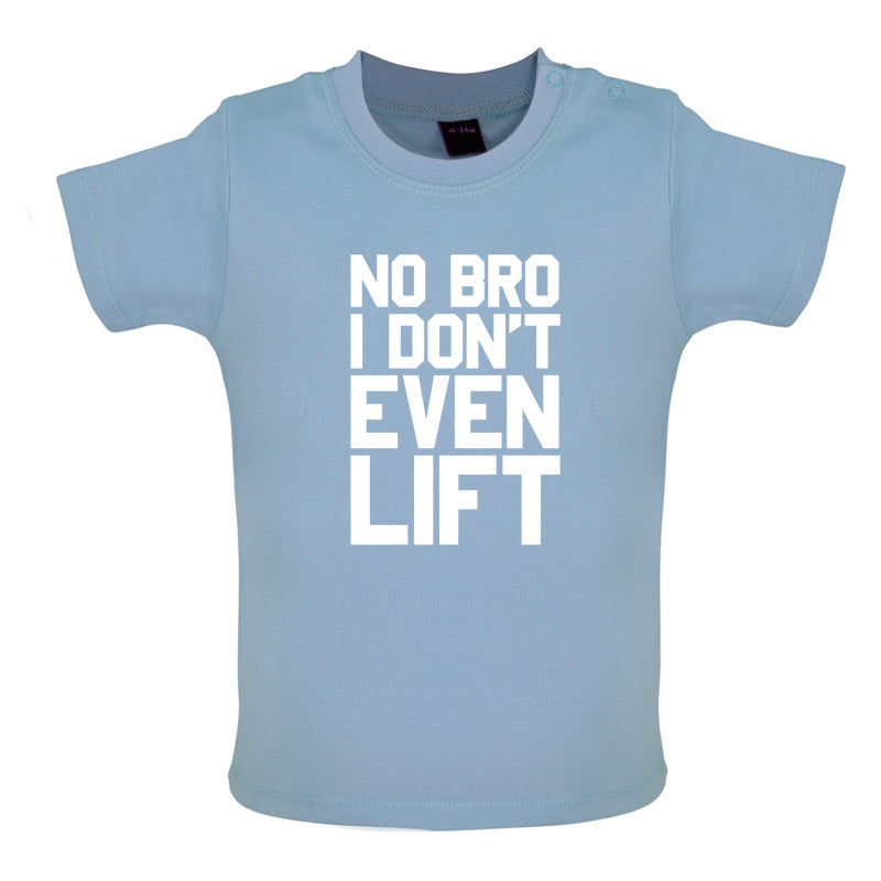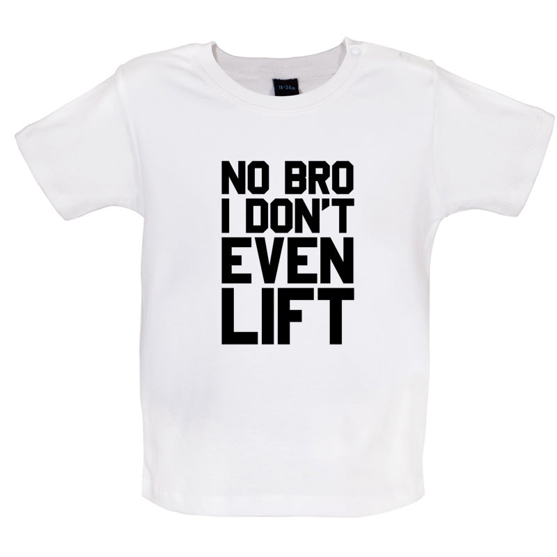 Baby/Toddler T-shirt: Our Baby Unisex style No Bro I Dont Even Lift T-shirt is printed on our high quality 200 gsm ringspun cotton garment which features shoulder poppers to ease getting your little one dressed. Our Baby T-shirts are available in a choice of Eight colours.