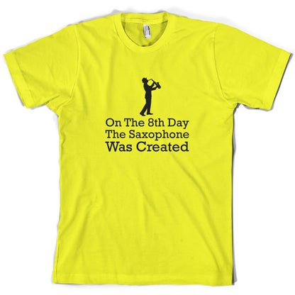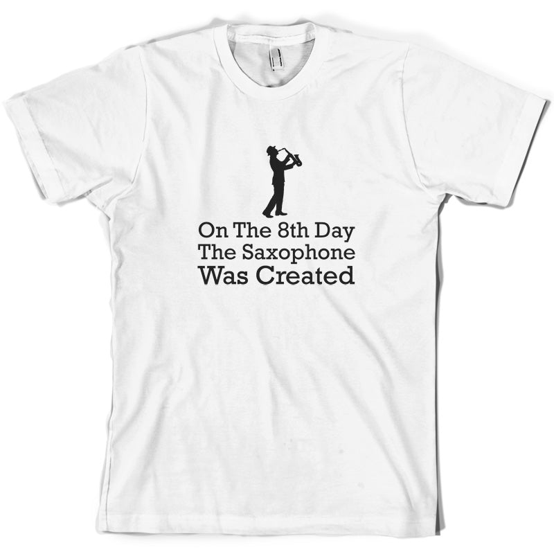 Mens Unisex T-Shirt, our men's On The 8th Day Saxophone Was Created t shirt is printed onto our premium 190 GSM one piece crew neck t-shirt. Available in 10 Colours and from Size Small to XXL.
