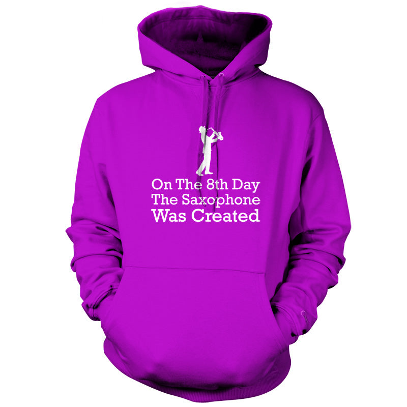 Unisex Hoodie, Our unisex style On The 8th Day Saxophone Was Created Hooded top is printed on our 280 GSM kangaroo pocket garment and is Available in 9 Colours and with sizes Small to XXL.