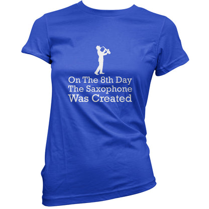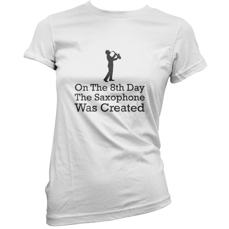 Women's Slim fit T-shirt, our ladies On The 8th Day Saxophone Was Created t-shirt is printed on our popular 150 GSM ring spun womens garment. Available in 11 colours and from Size Small to XXL.