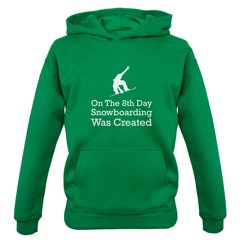 Kids Hoodie: Our kids unisex style On The 8th Day Snowboarding Was Created Hoodie is printed on our 300 GSM kangaroo pocket hooded top and is available on 7 different Colours.