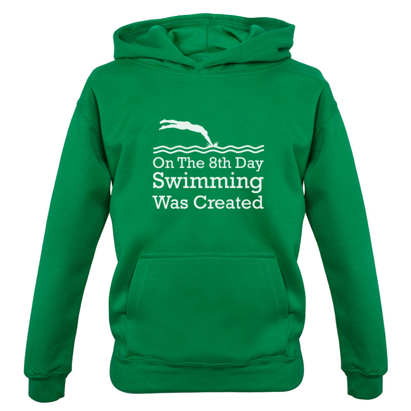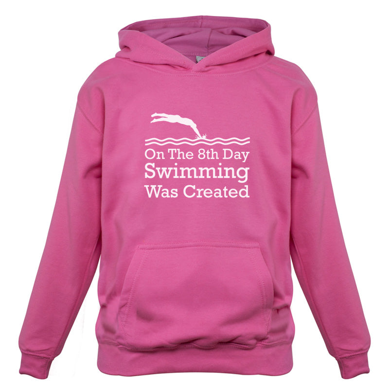 Kids Hoodie: Our kids unisex style On The 8th Day Swimming Was Created Hoodie is printed on our 300 GSM kangaroo pocket hooded top and is available on 7 different Colours.