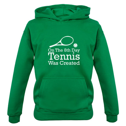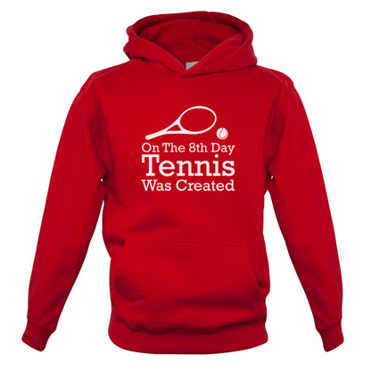 Kids Hoodie: Our kids unisex style On The 8th Day Tennis Was Created Hoodie is printed on our 300 GSM kangaroo pocket hooded top and is available on 7 different Colours.
