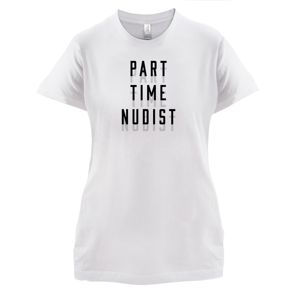 Women's Slim fit T-shirt, our ladies Part Time Nudist t-shirt is printed on our popular 150 GSM ring spun womens garment. Available in 11 colours and from Size Small to XXL.
