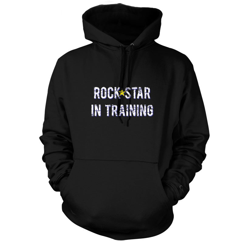 Unisex Hoodie, Our unisex style Rock Star In Training Hooded top is printed on our 280 GSM kangaroo pocket garment and is Available in 9 Colours and with sizes Small to XXL.